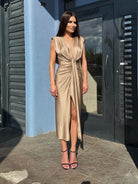 Роклята KIM е създадена за жени, които не се страхуват да бъдат забелязани. С елегантна драпировка, подчертана талия и дълбоко V-деколте, този модел комбинира сексапил с изисканост. Изработена от лека, еластична материя с луксозен сатениран финиш, роклята подчертава силуета и се адаптира към тялото благодарение на универсалния си размер.