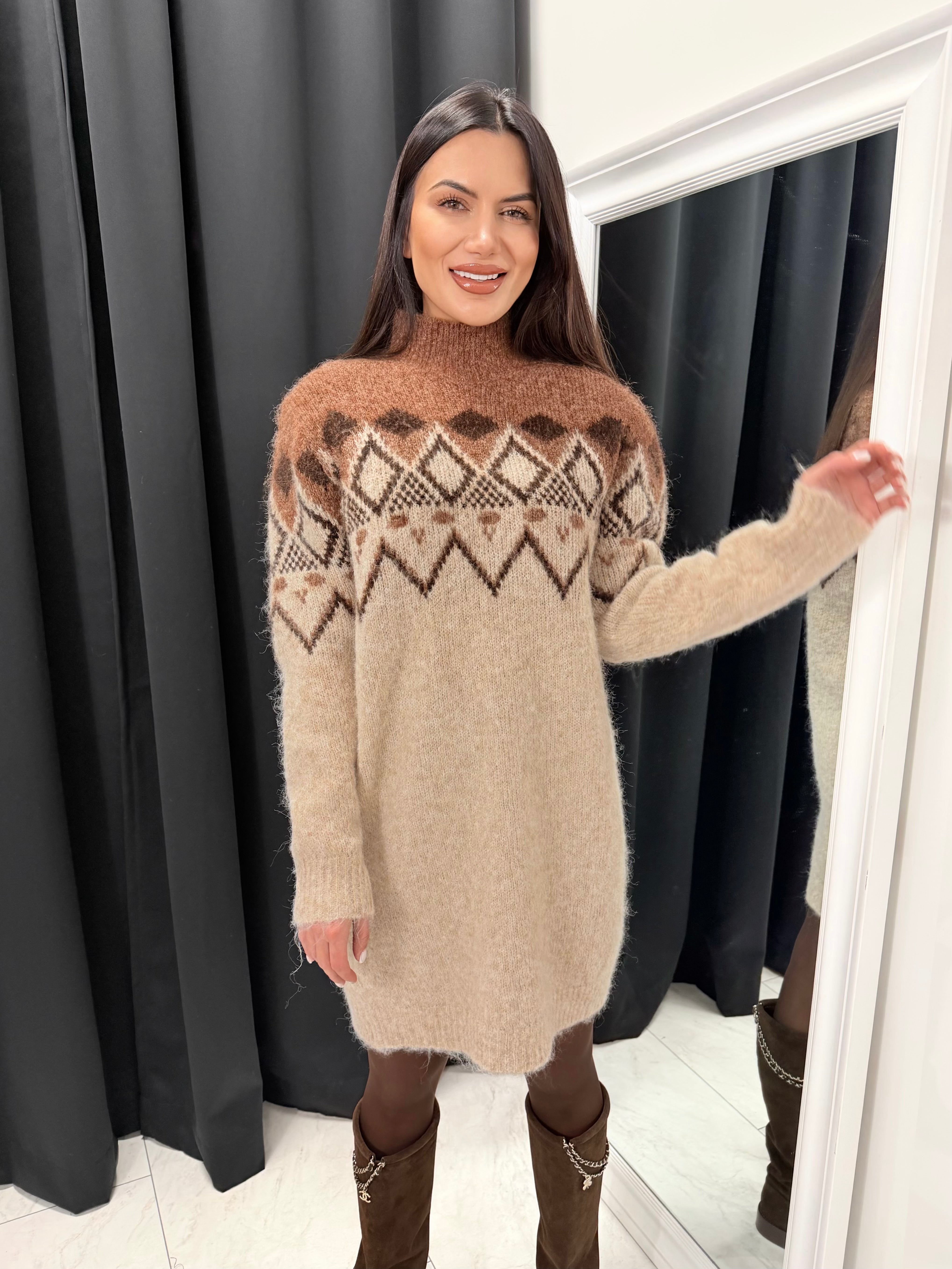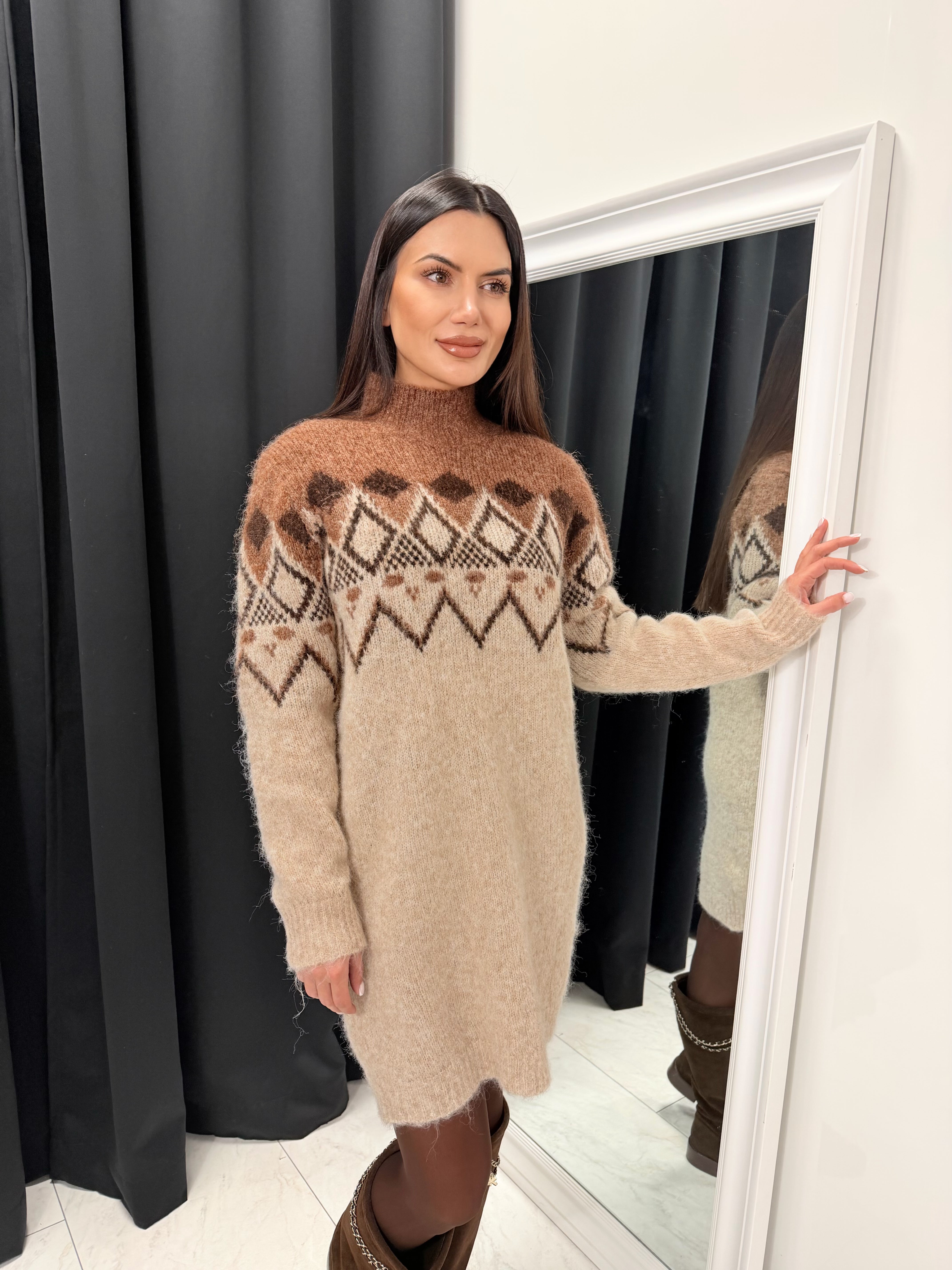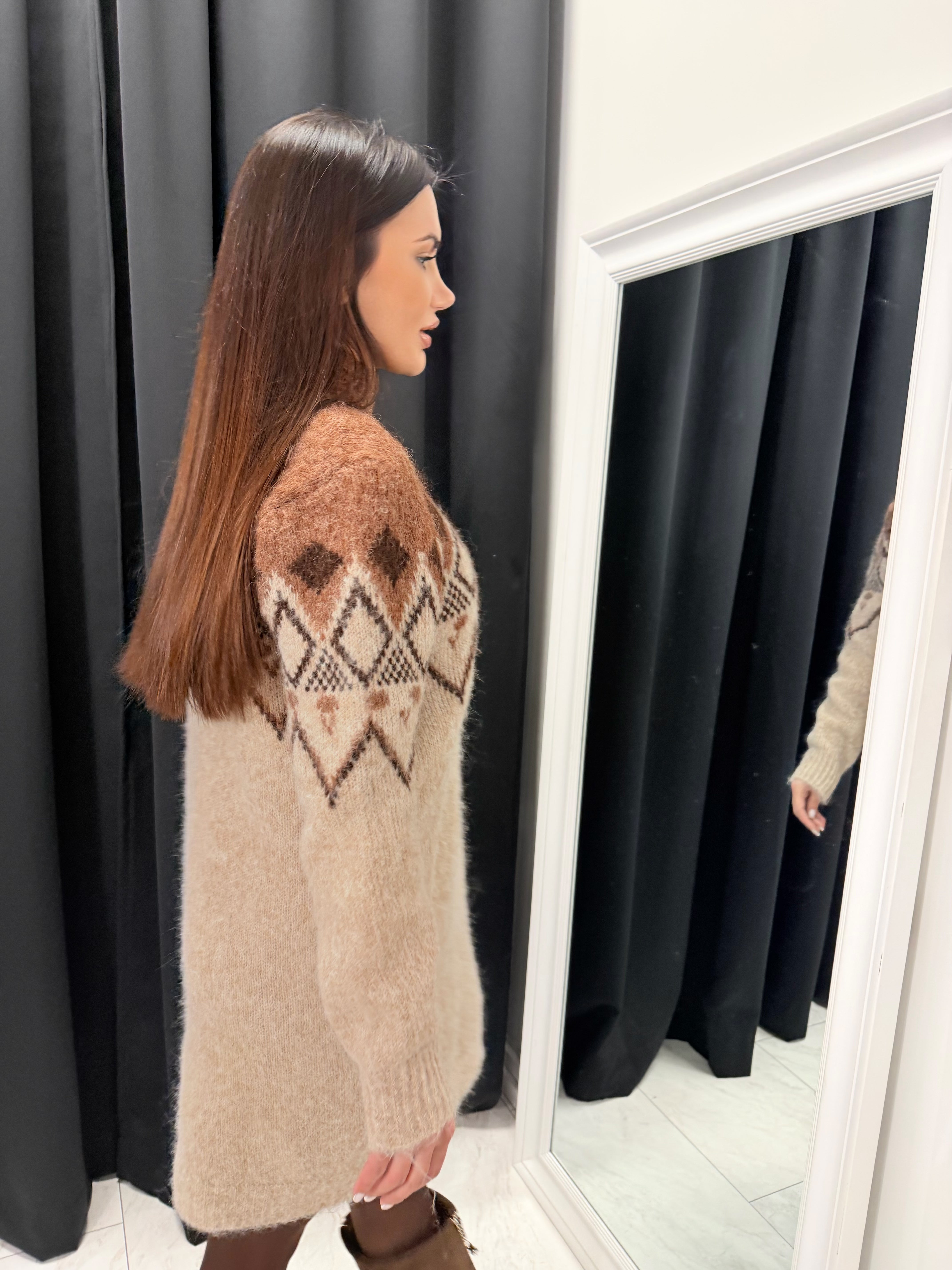 Елегантна и уютна, Knit Dress е създадена за стилните зимни визии с характер. Плетената материя с меко докосване обгръща тялото комфортно, а геометричният зимен мотив придава модерен Nordic акцент и визуална дълбочина.