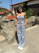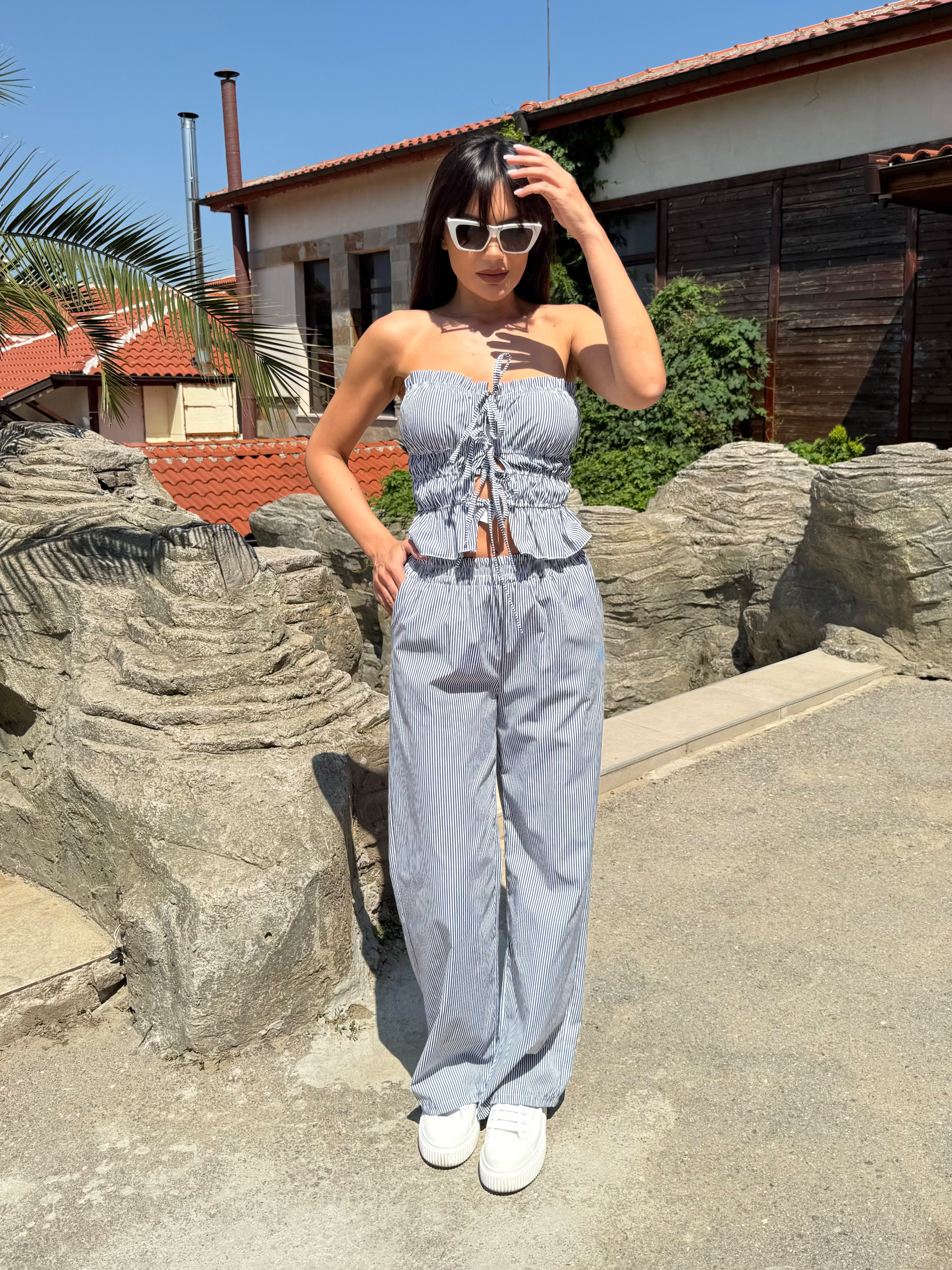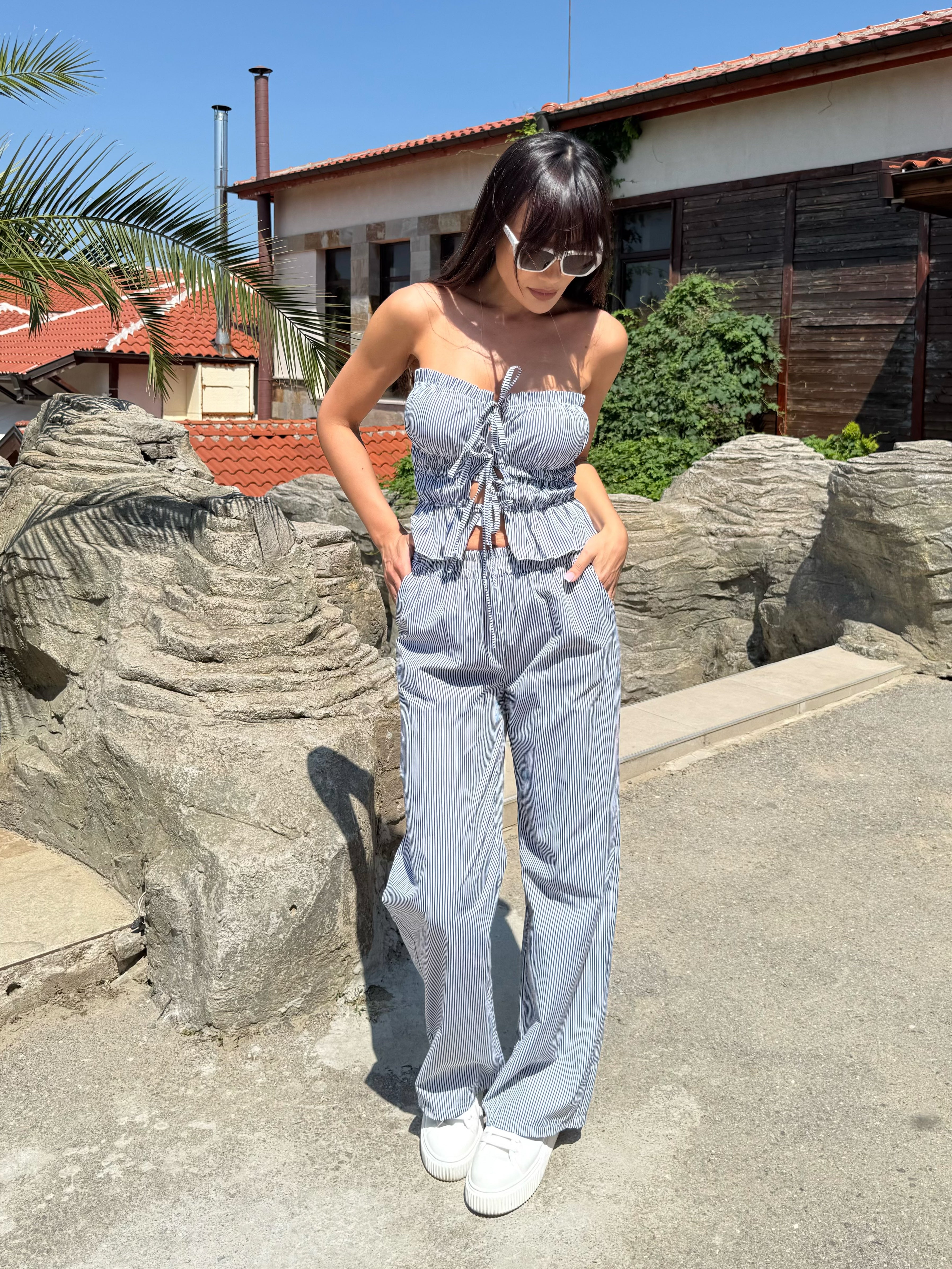 Летен стил и непринудена елегантност – това е комплектът “Stripe Breeze”. Състои се от къс топ без презрамки с ефектни връзки отпред и широк панталон с висока талия и фини вертикални райета, които издължават силуета. Подходящ както за разходка край морето, така и за градски летен ден.