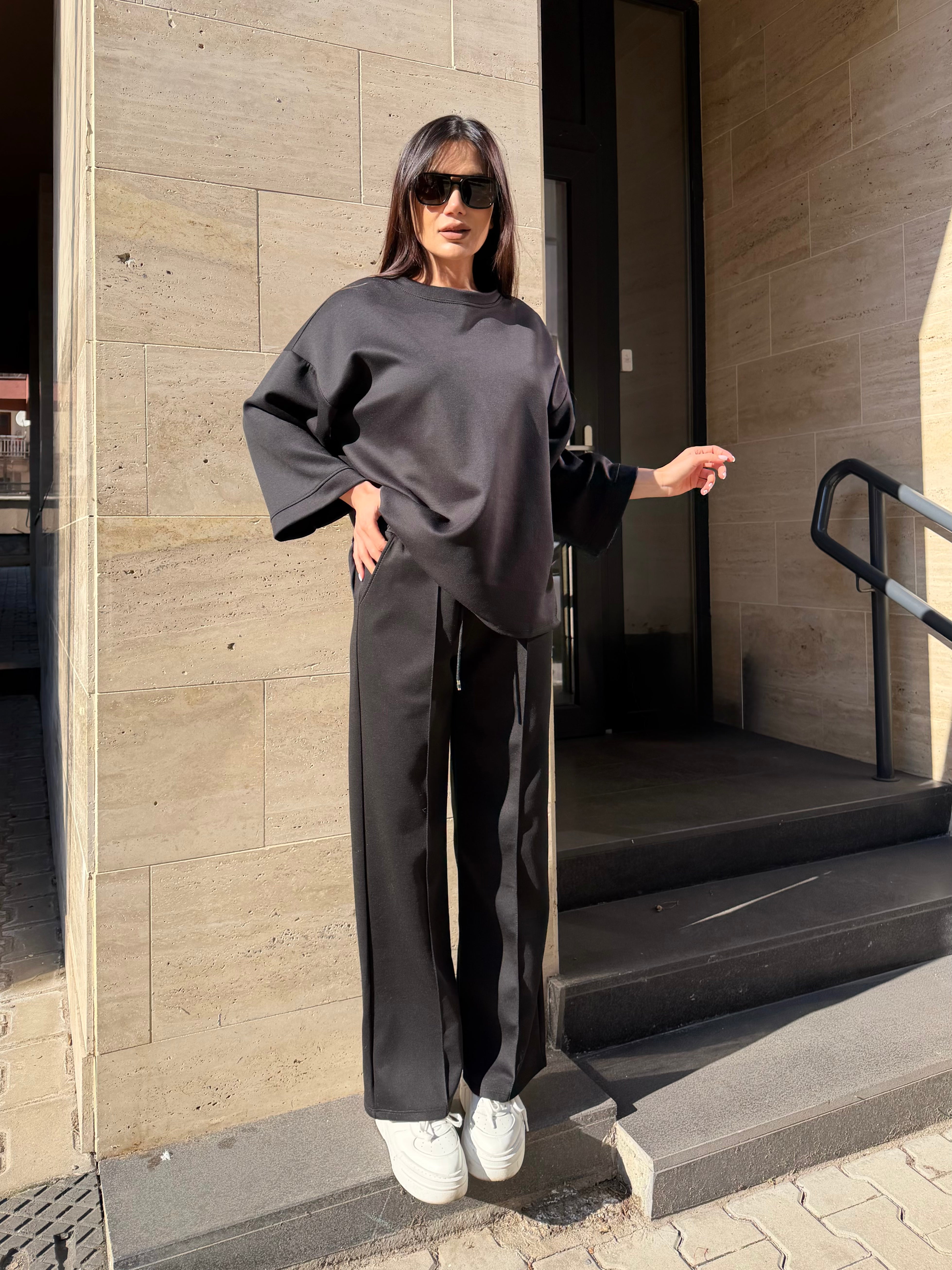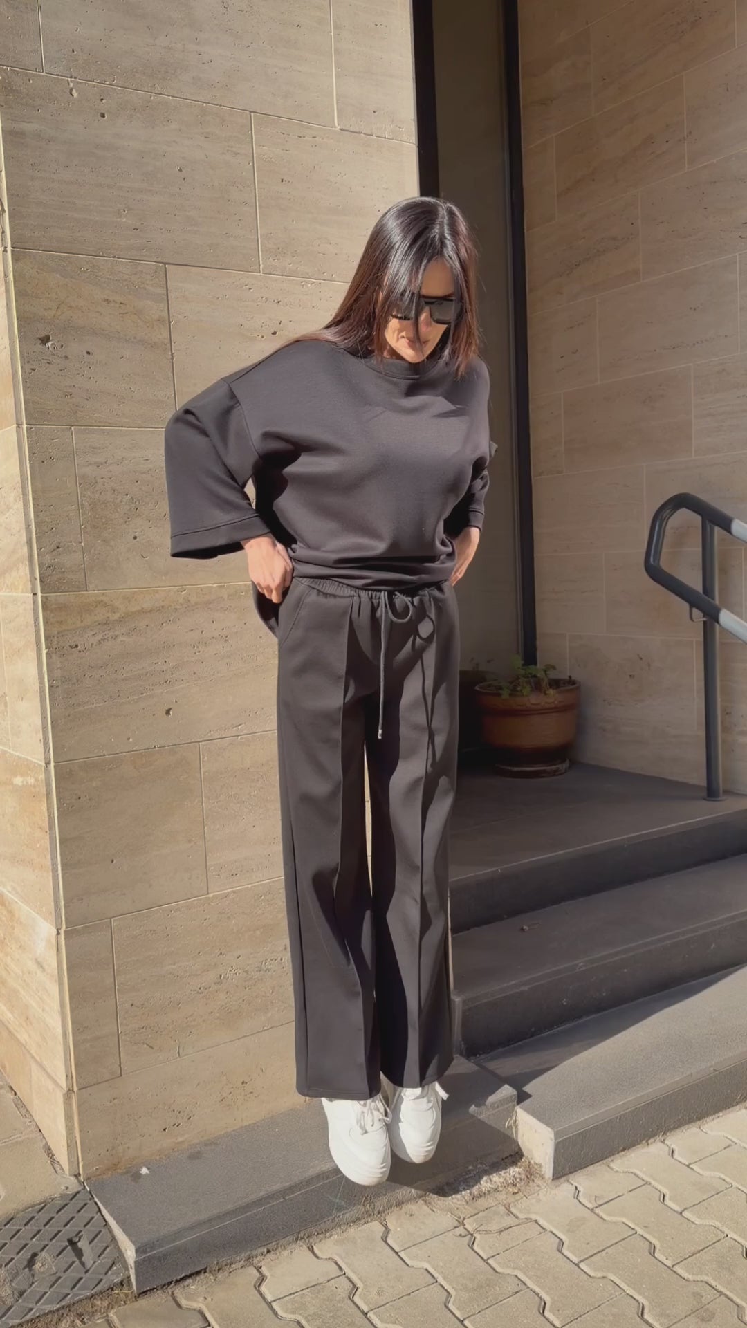 Елегантен комплект от две части, създаден за стил и комфорт в ежедневието. Моделът включва свободна блуза с модерна линия и широк панталон с еластична талия, който подчертава силуета и осигурява удобство през целия ден.
