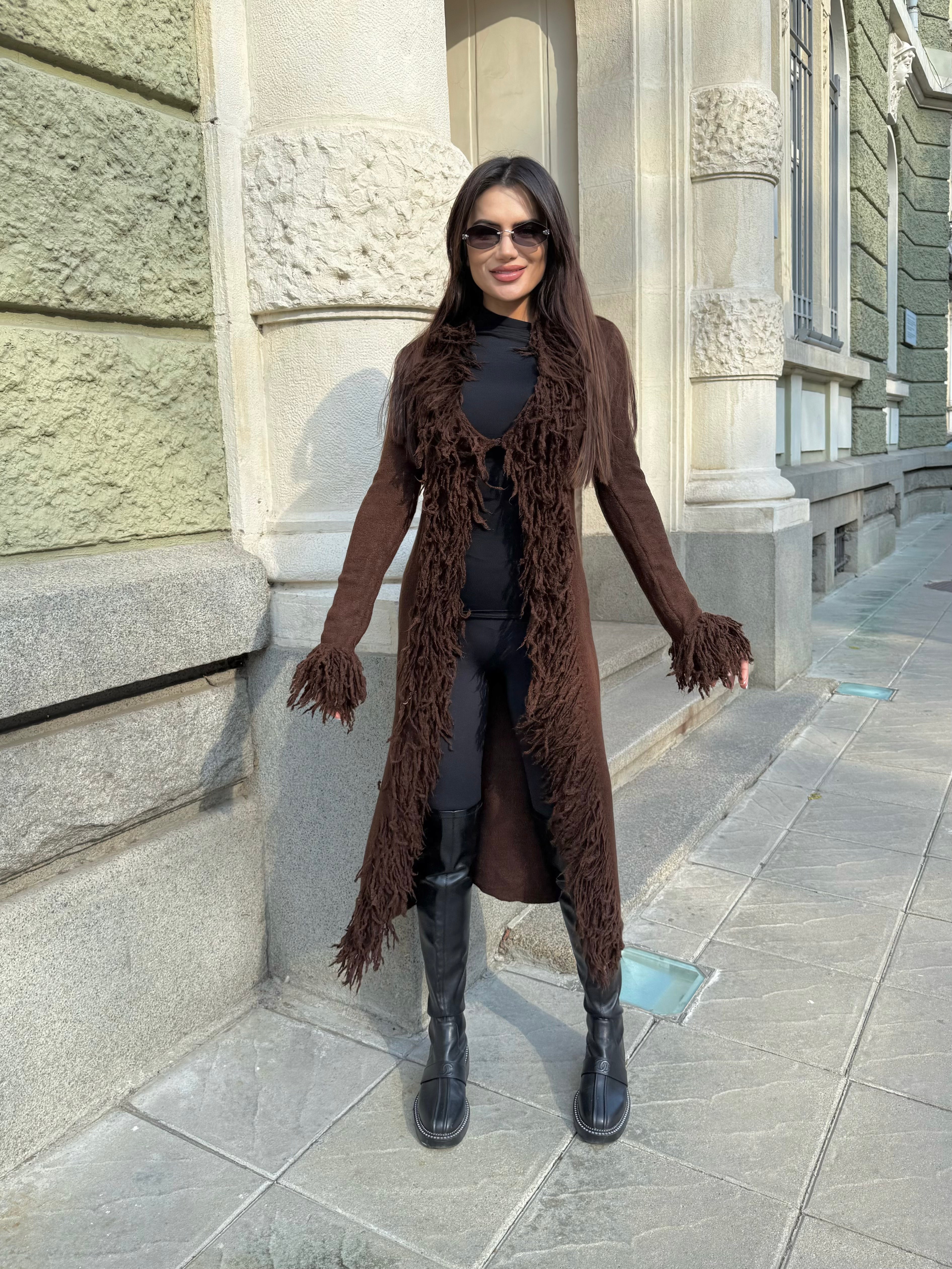 VEST made of fine elastic dense knit with a loose cut. The model can be worn as a jacket or coat.
