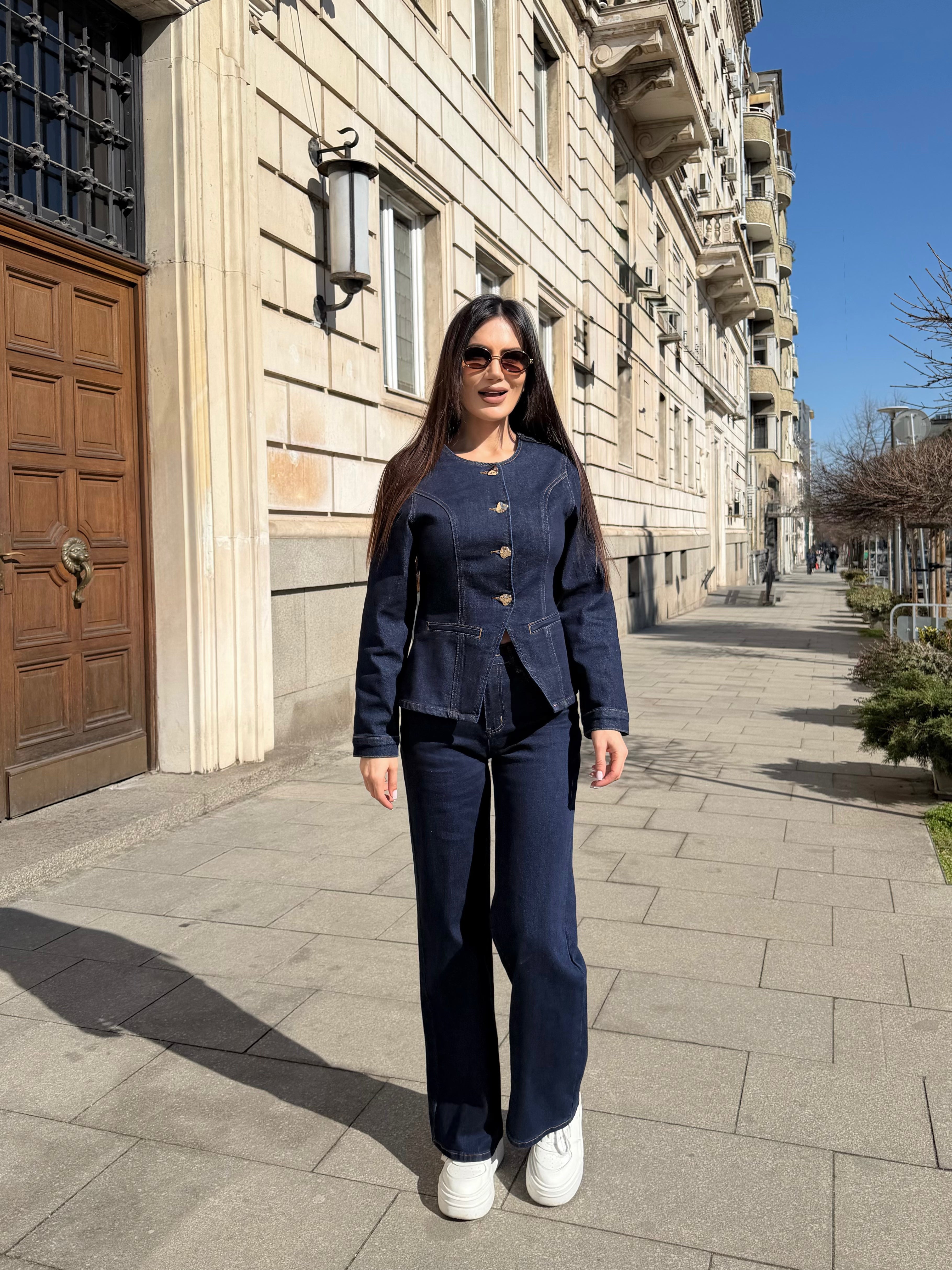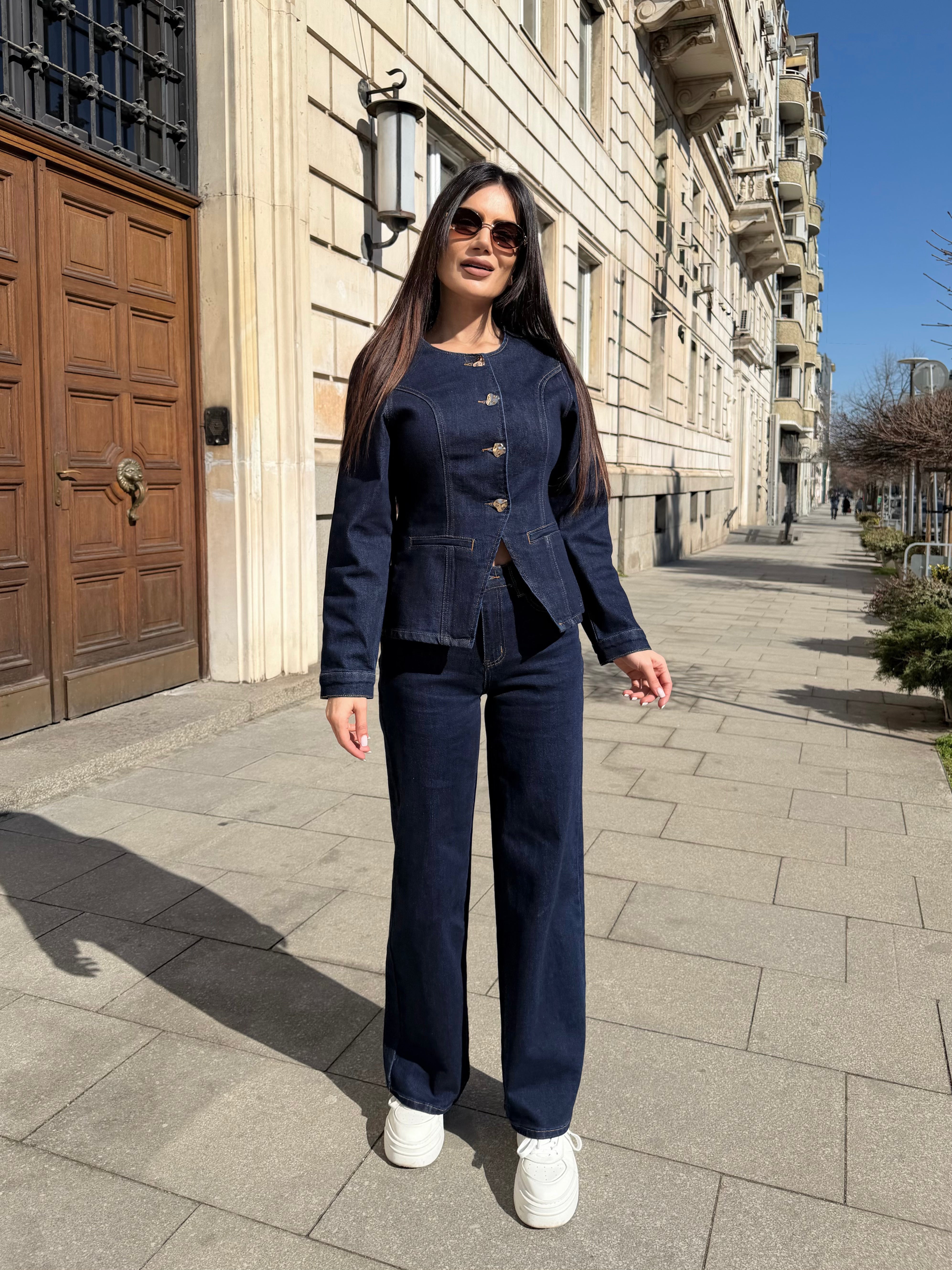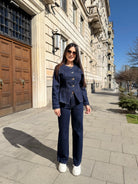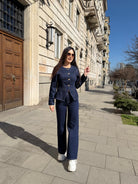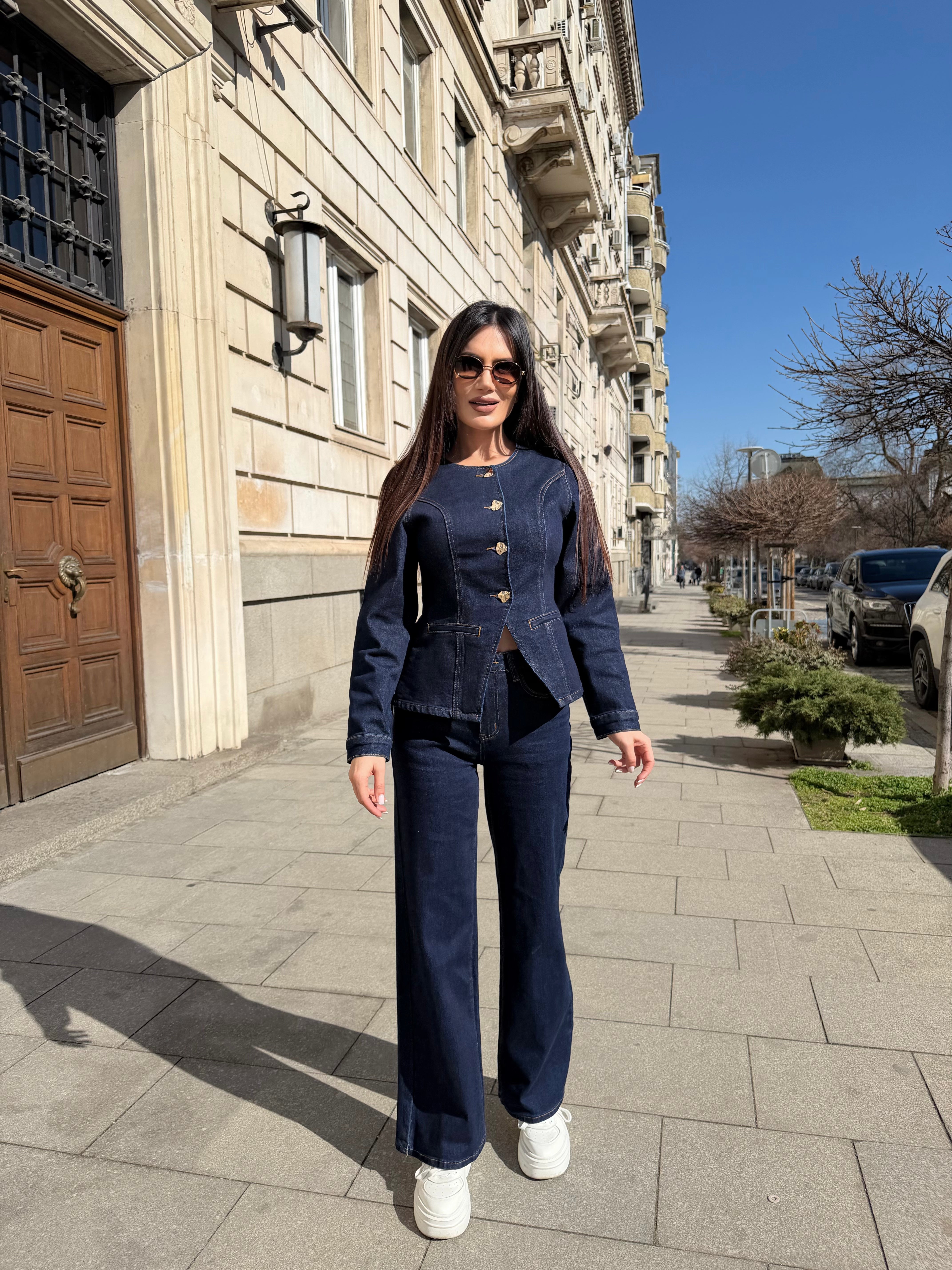Elegant two-piece denim set featuring a structured fitted jacket and high-waisted wide-leg trousers. Designed to enhance the silhouette and visually elongate the figure.
