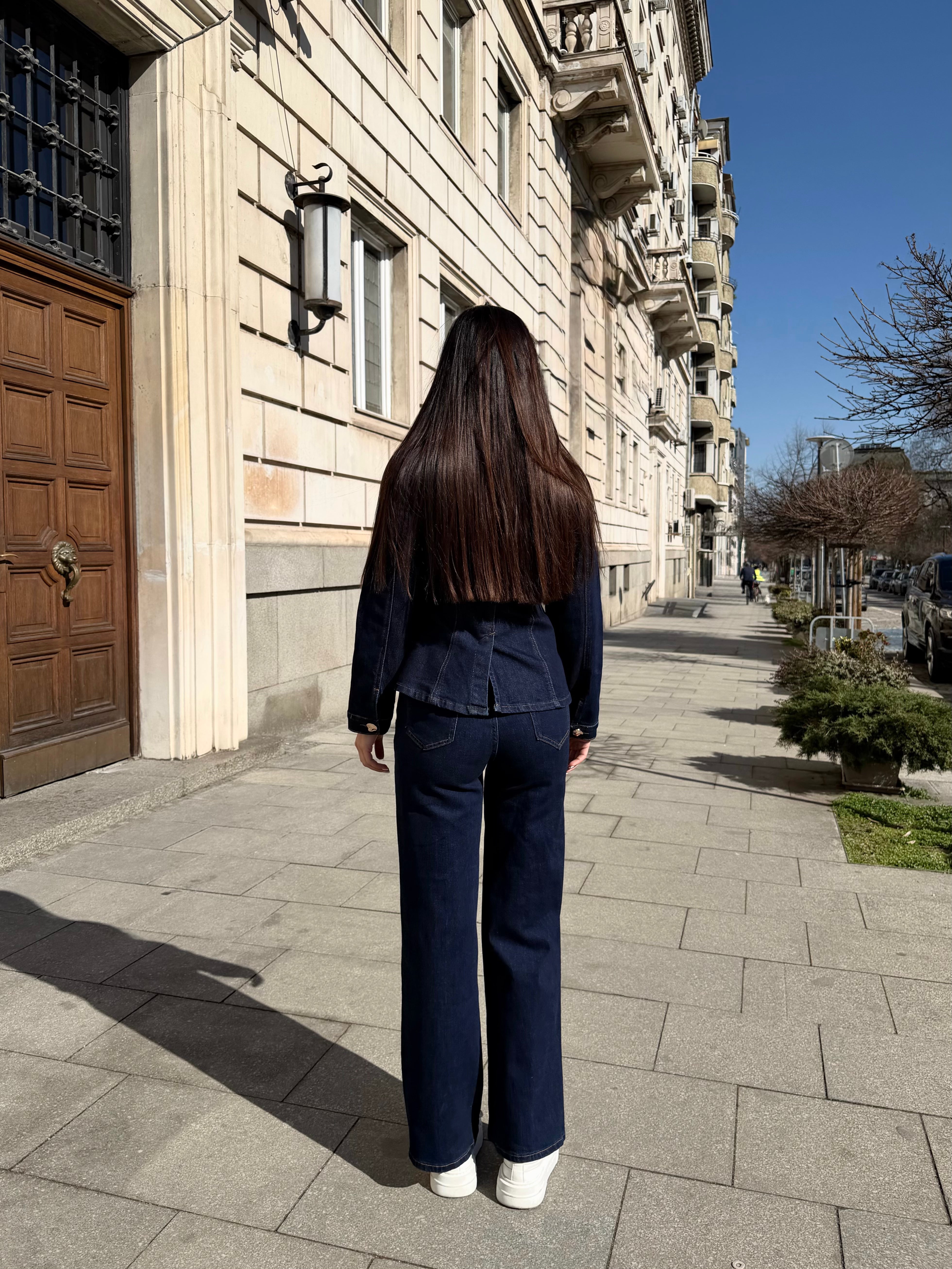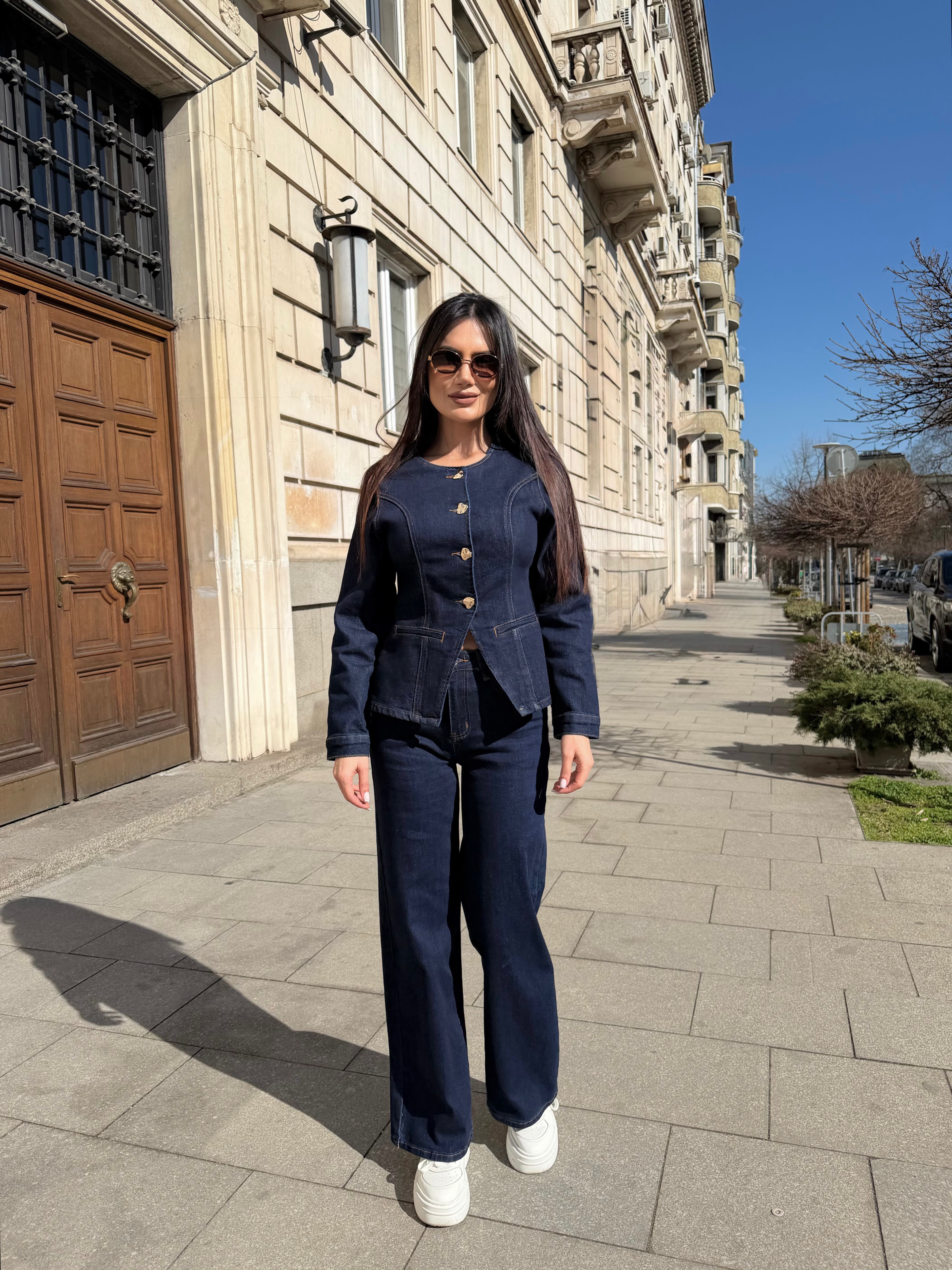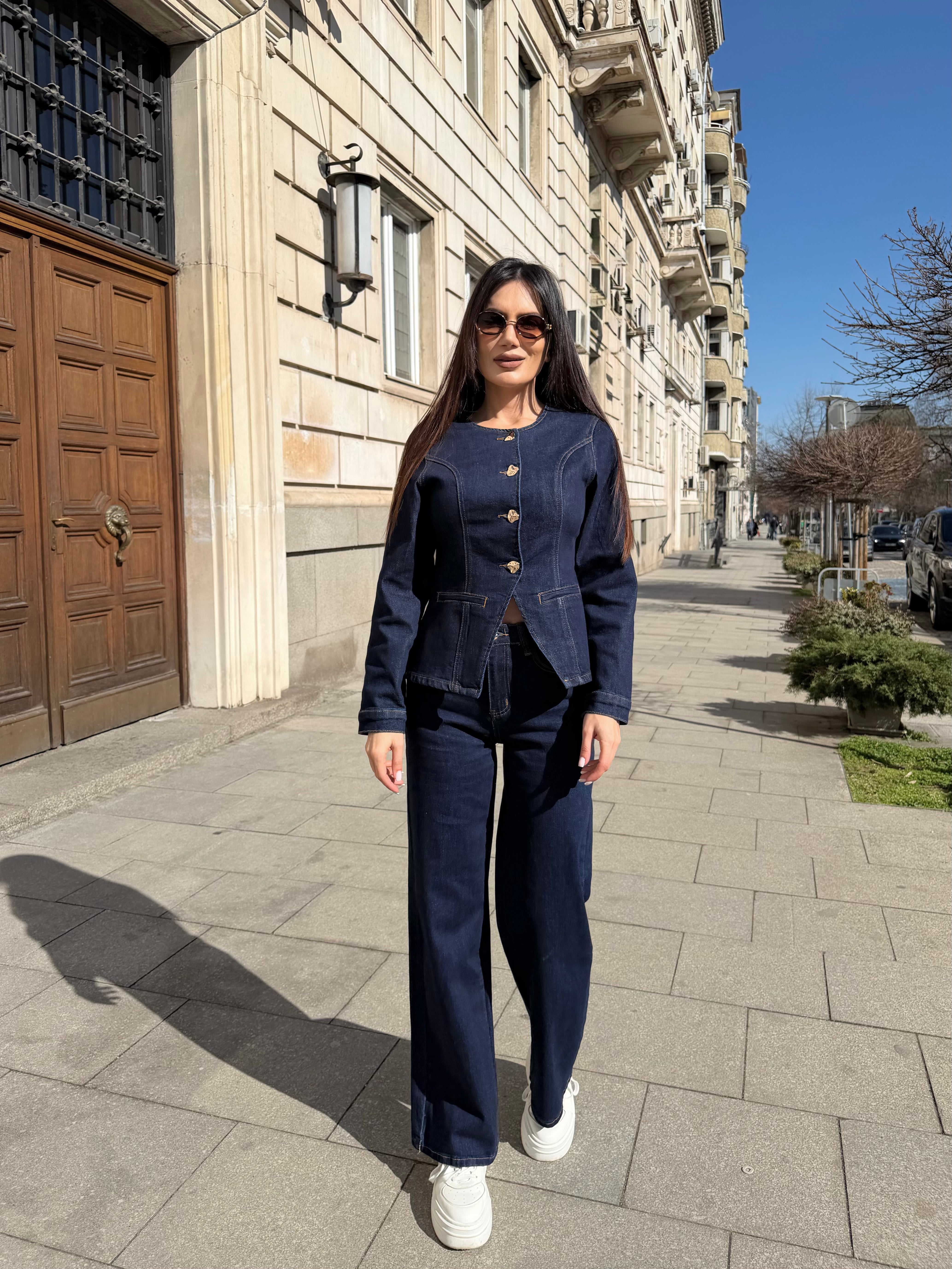 Elegant two-piece denim set featuring a structured fitted jacket and high-waisted wide-leg trousers. Designed to enhance the silhouette and visually elongate the figure.
