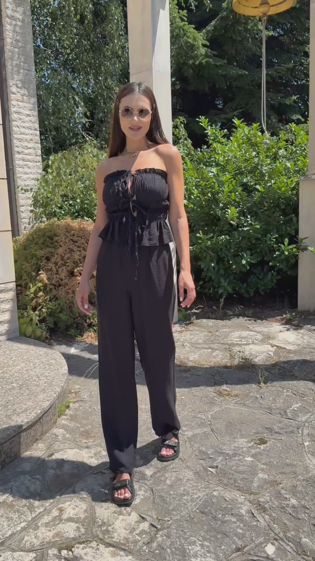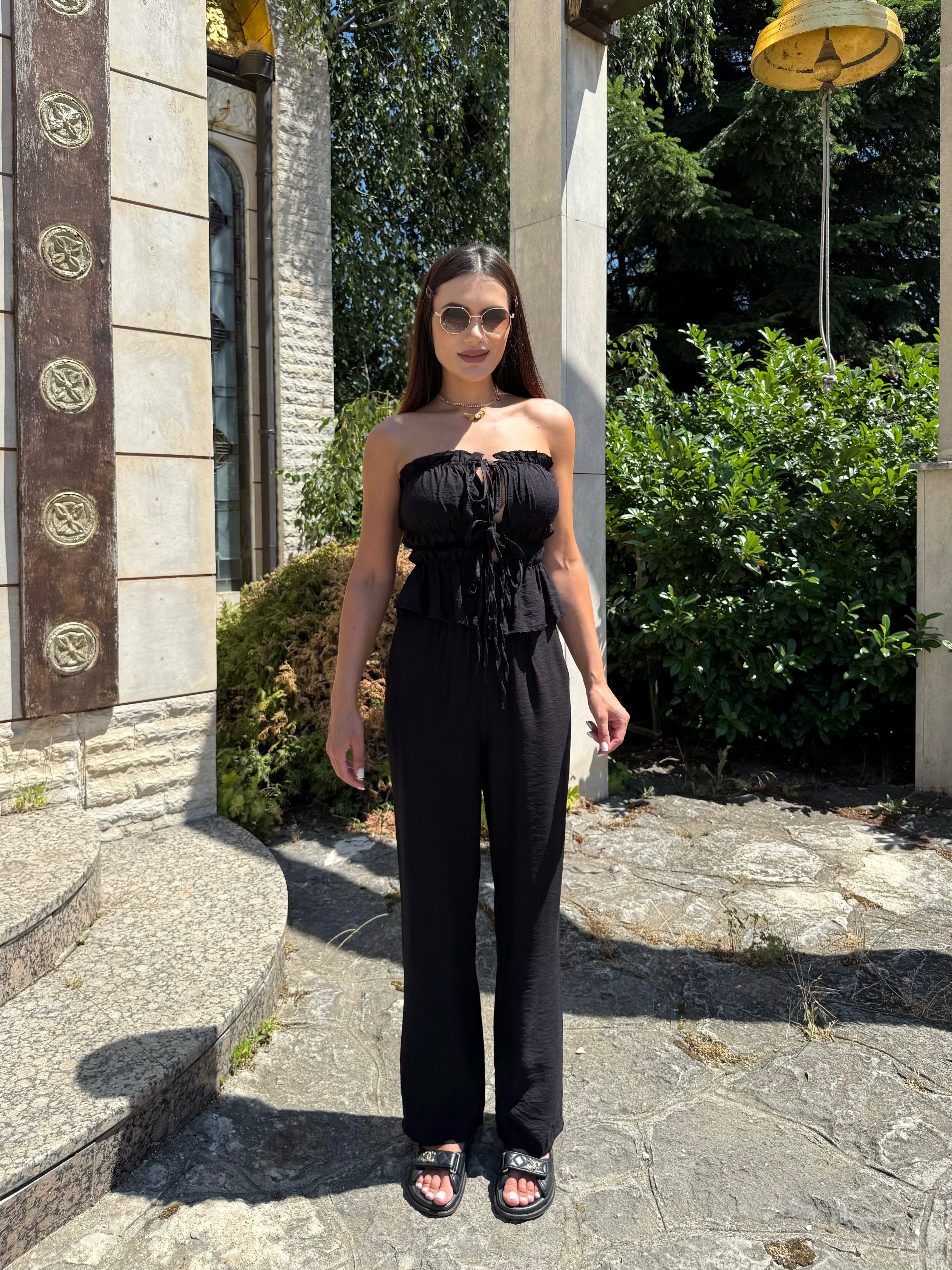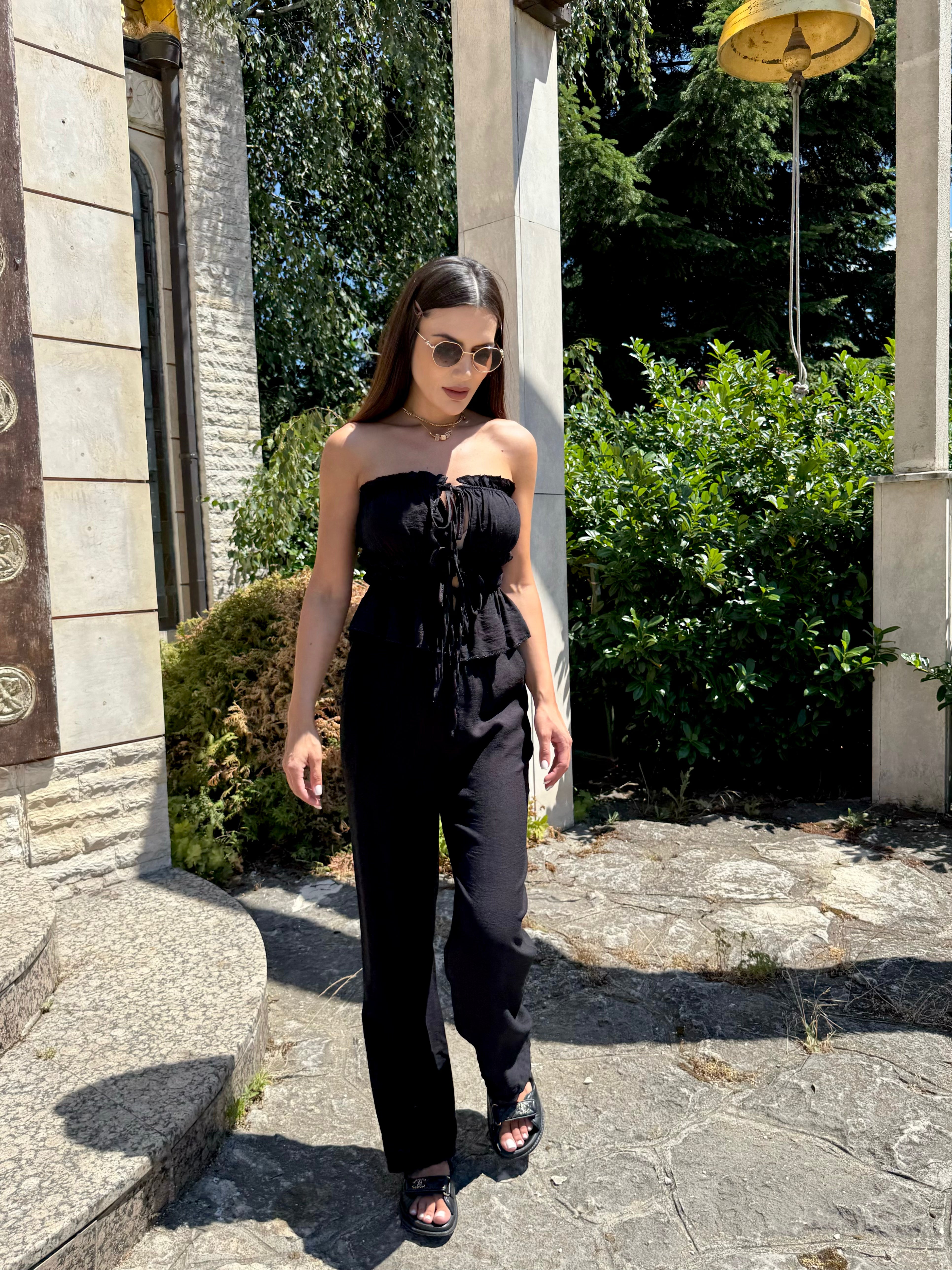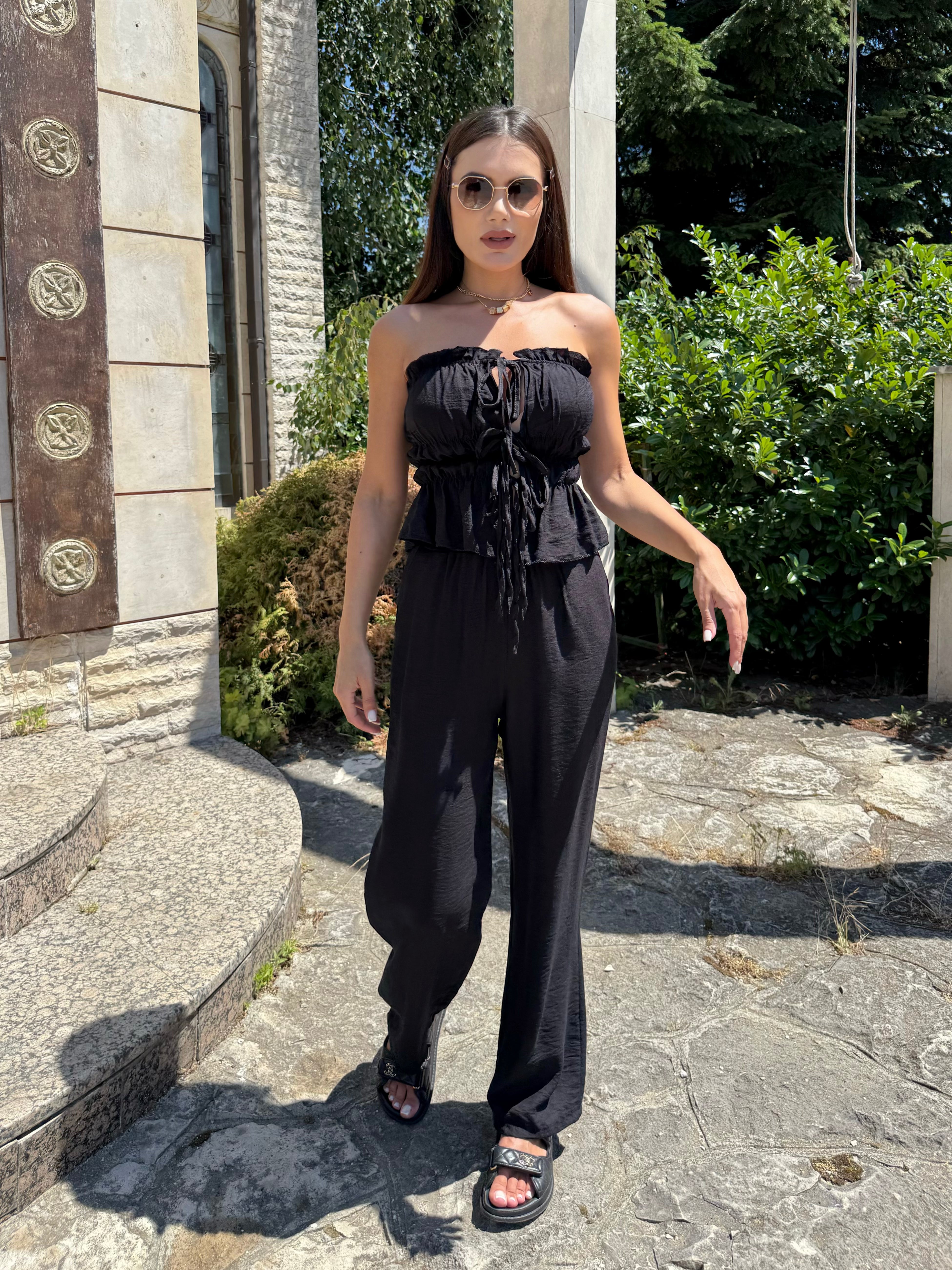 The deep and warm shade gives a sense of luxury and earthy energy, while the precise cut delicately emphasizes curves. The top with pleats and ties forms an elegant line, and the wide trousers with a high waist bring lightness and confidence.