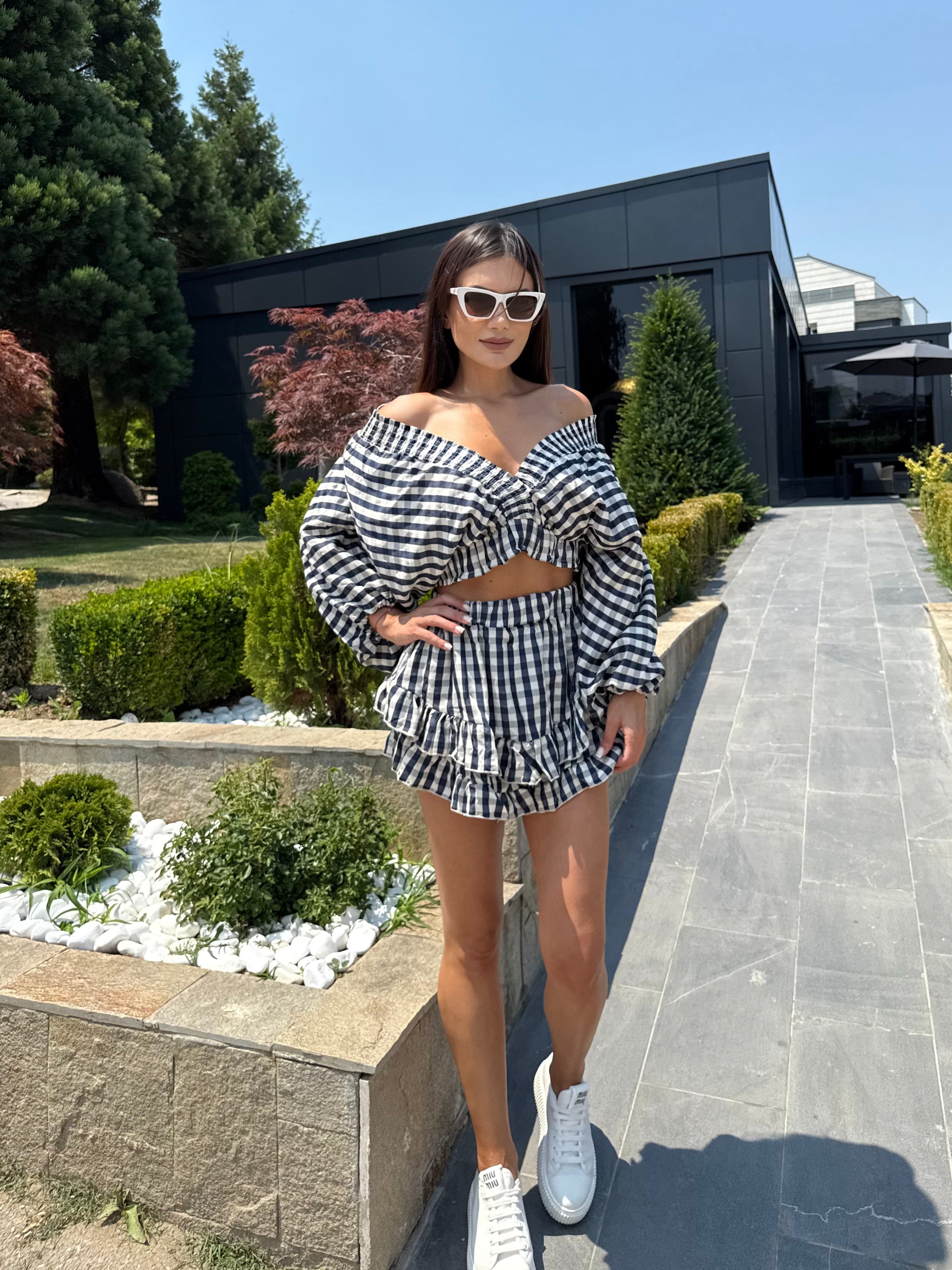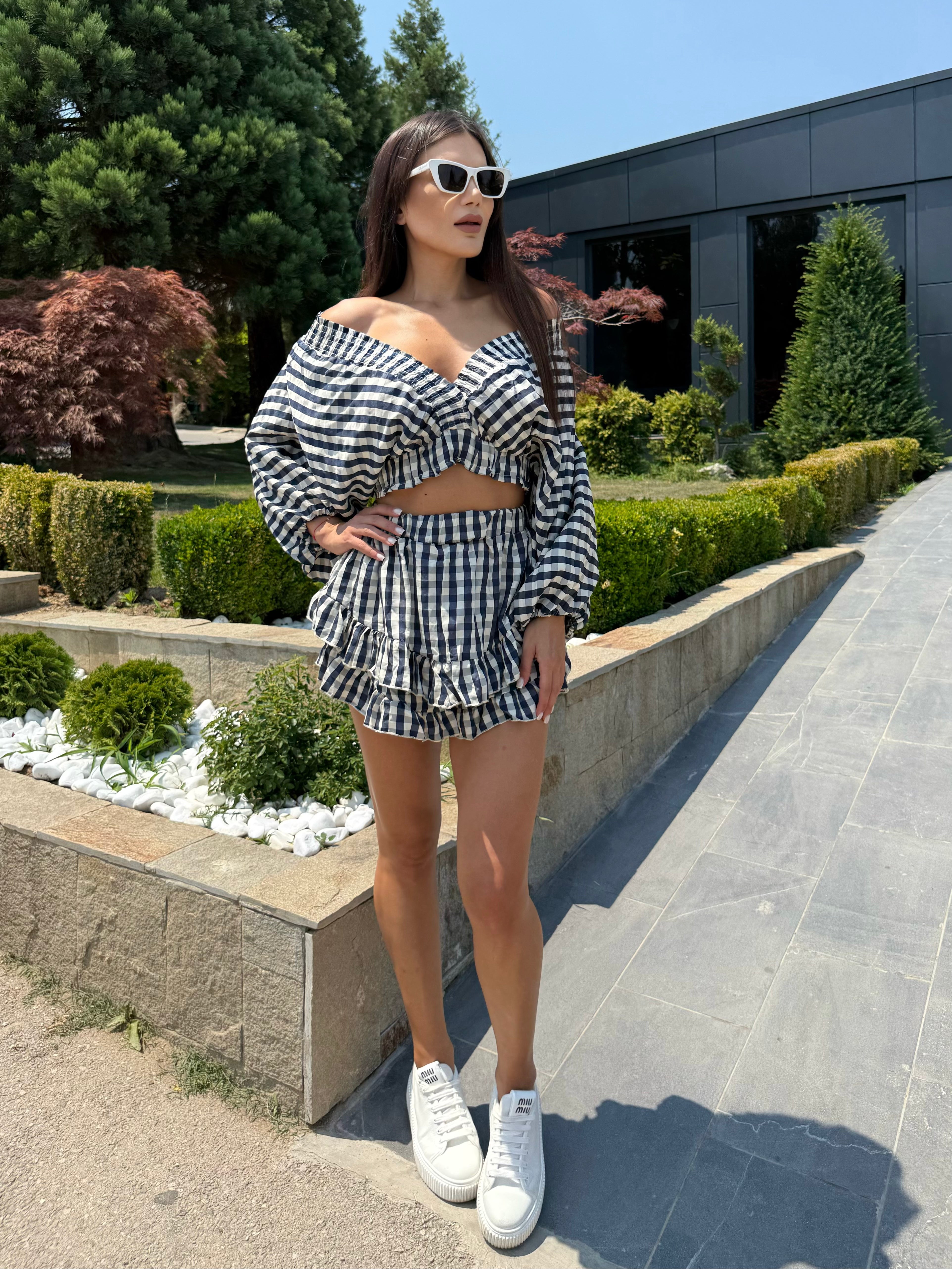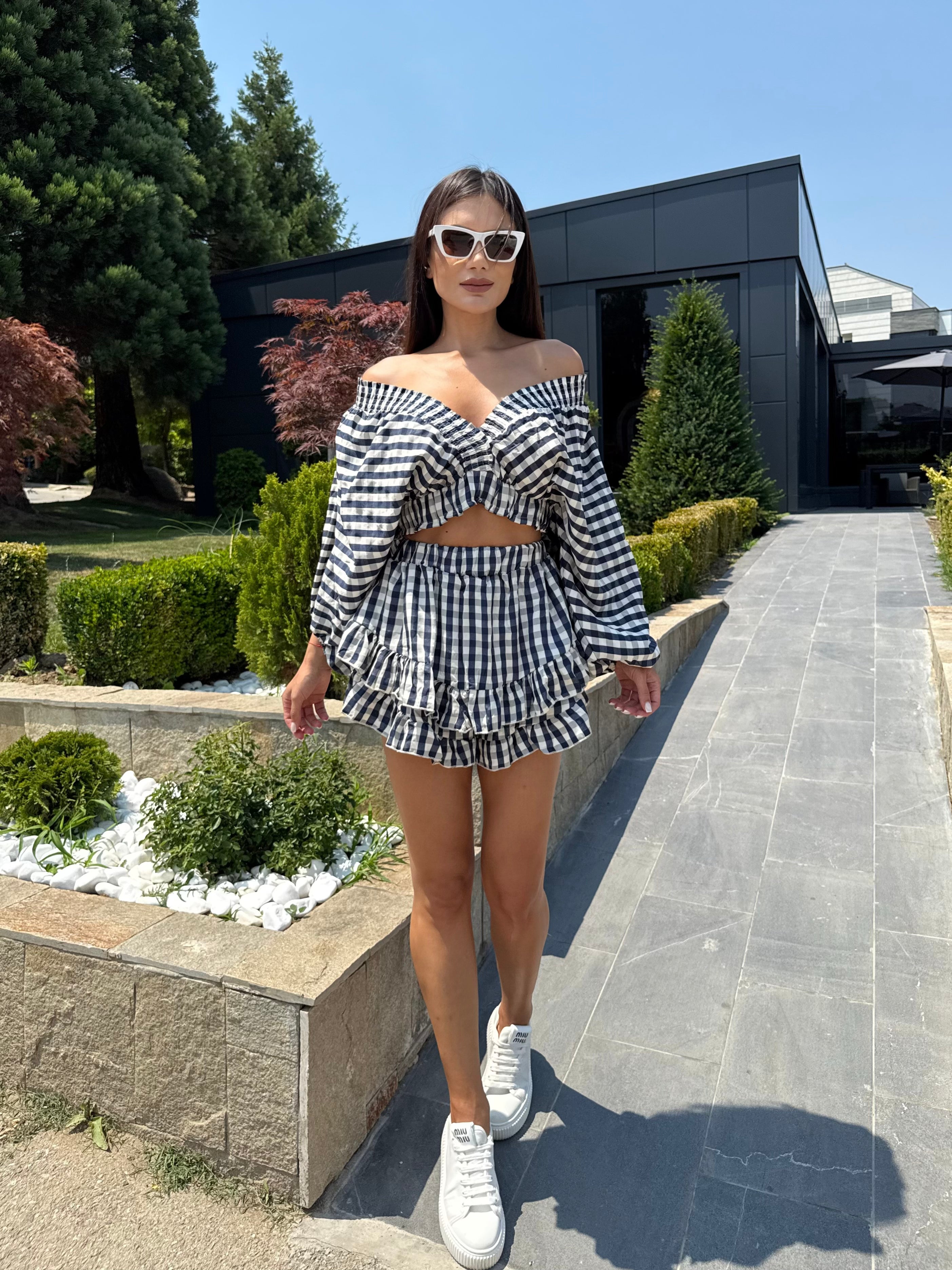 The summer “it” set that combines comfort and chic in one. Kylie consists of a short top with voluminous sleeves and a feminine V-neck, combined with a skirt-pants with a playful silhouette. Suitable for an urban look, holiday walks or daytime events, this model is easy to style and guarantees impeccable style.