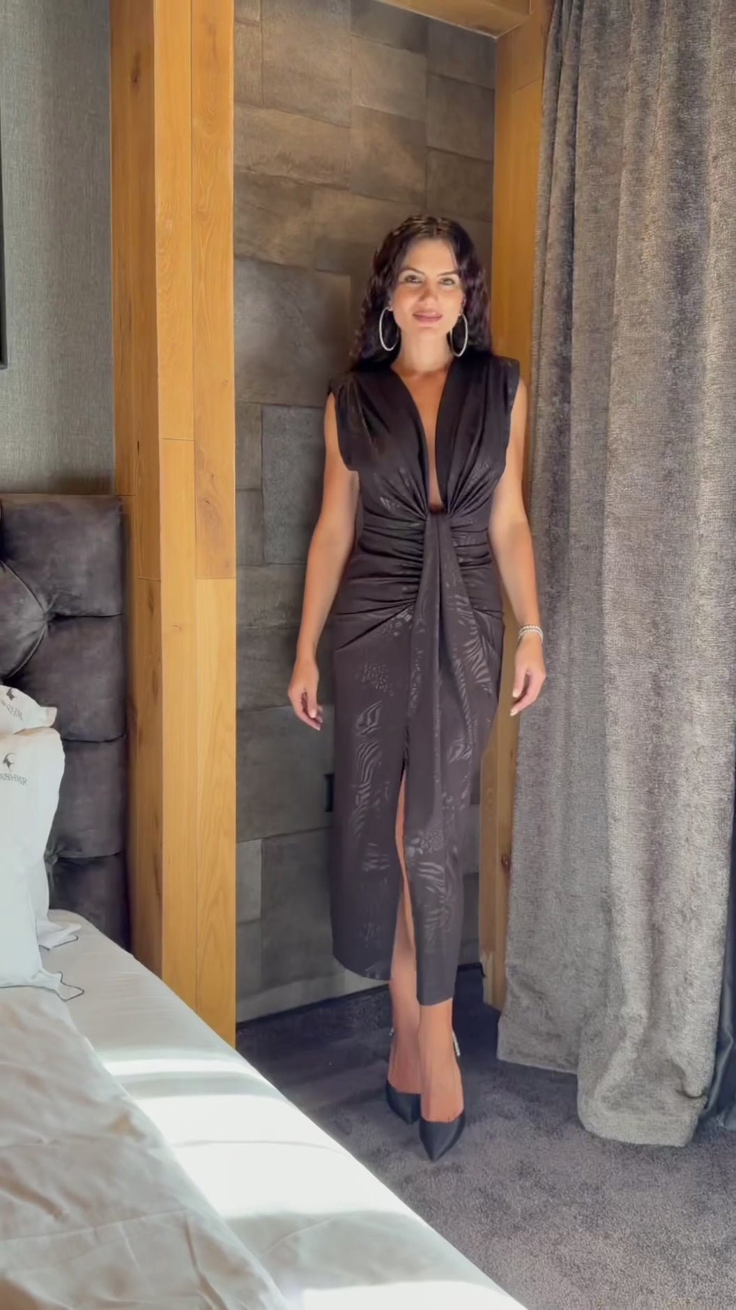 Designed with elegant draping, a defined waist and a deep V-neckline, this sleeveless silhouette enhances the figure with effortless sensuality and refined sophistication.