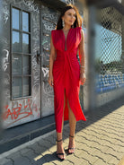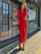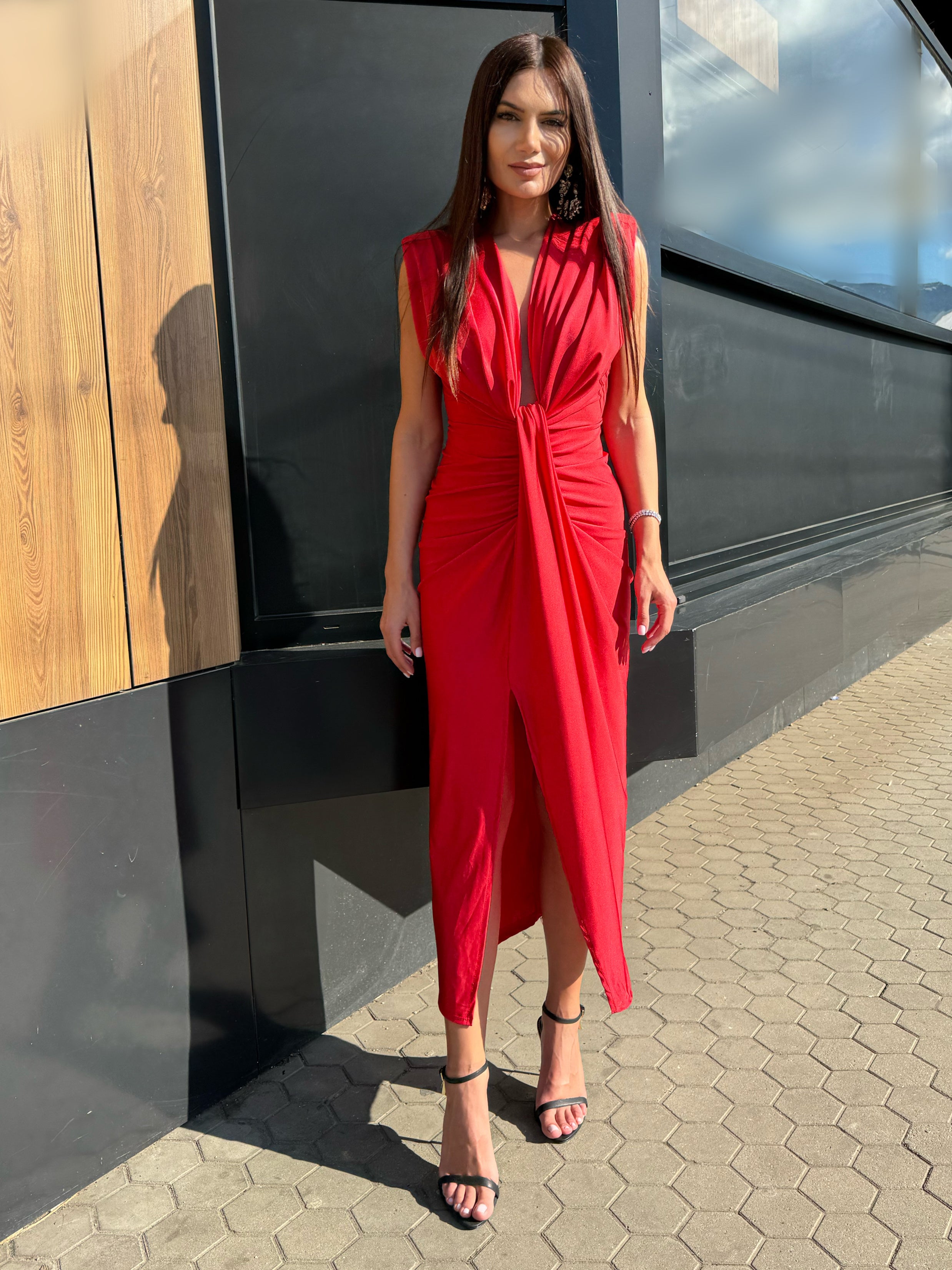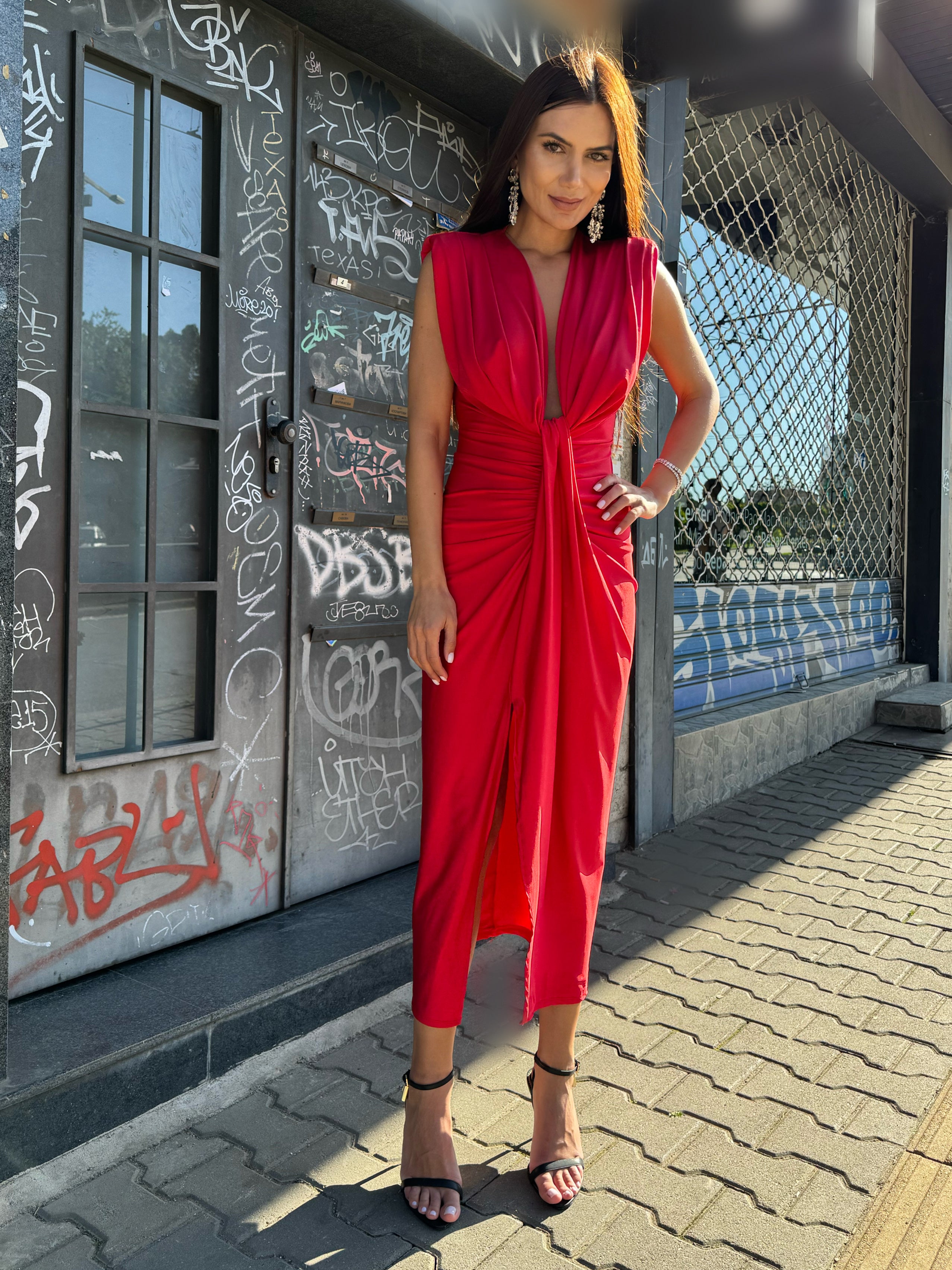 Elegant draping, a defined waist and a deep V-neckline create a perfectly balanced silhouette — sensual yet refined.