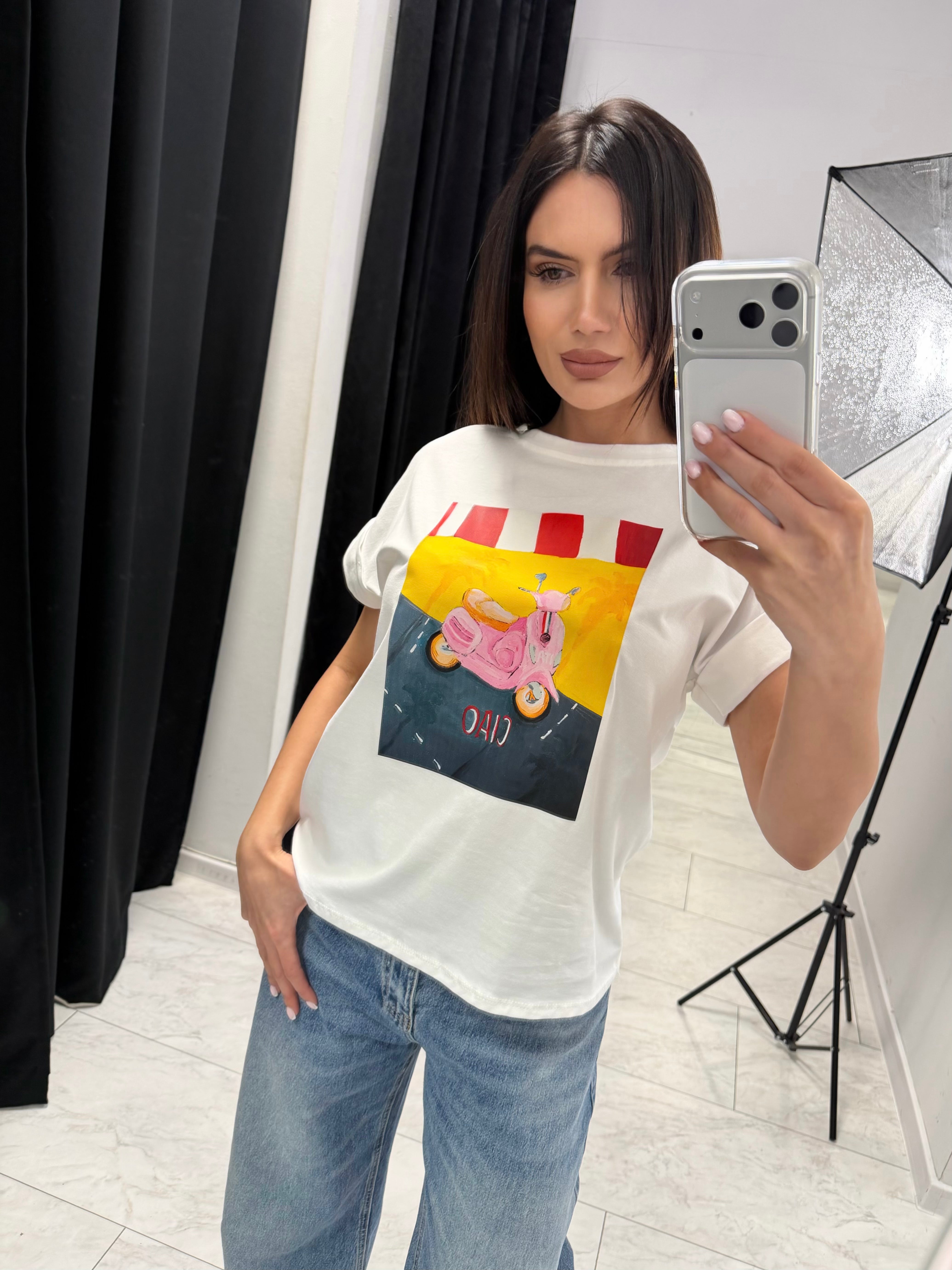 Featuring a vibrant retro scooter print with a playful “Ciao” detail, this piece adds a feminine and artistic touch to everyday outfits. The relaxed silhouette and soft stretch cotton blend provide comfort and ease all day long.