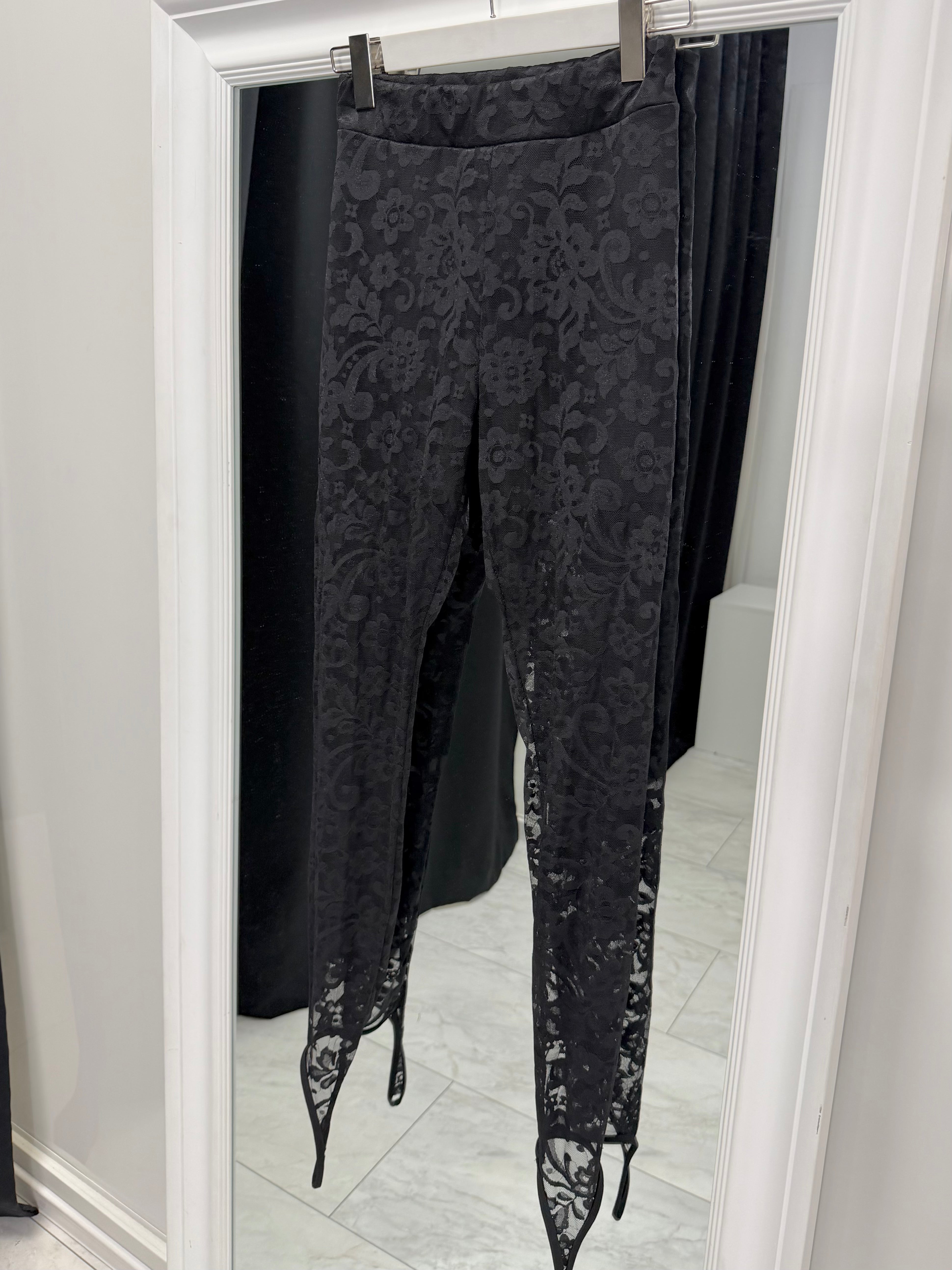 Stretch lace leggings featuring an elegant floral pattern. Designed with a stirrup that loops around the foot, visually elongating the legs and pairing perfectly with heels.