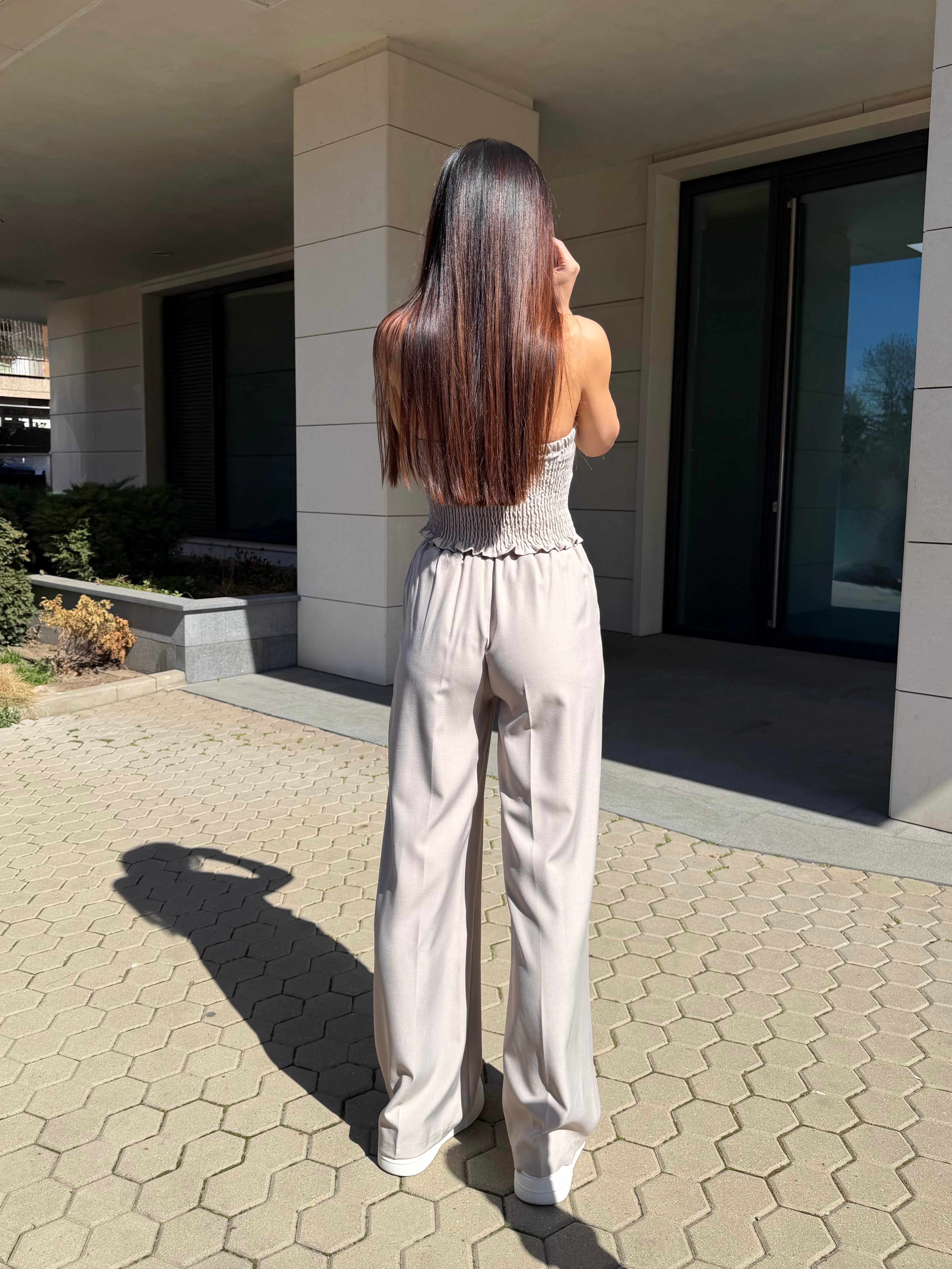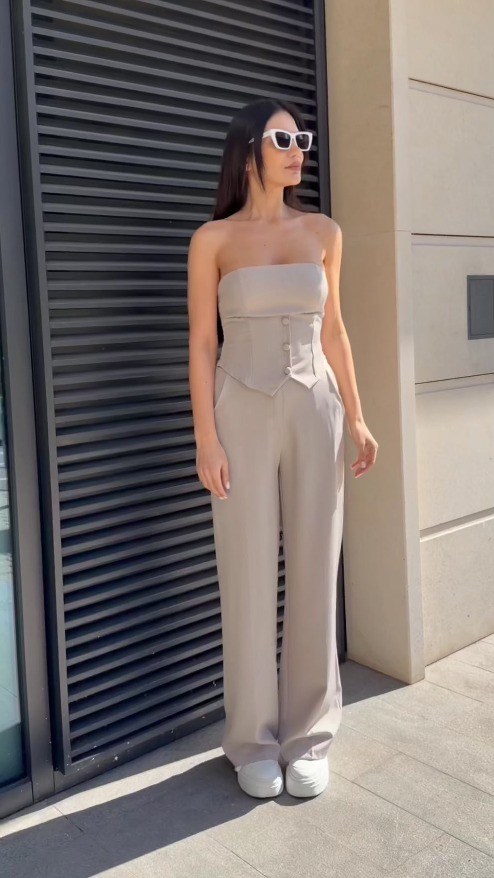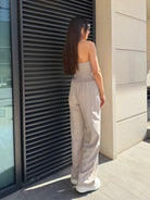 The bustier shapes the body with its elastic back, while the relaxed-fit trousers balance the look with modern elegance.
