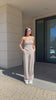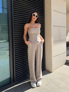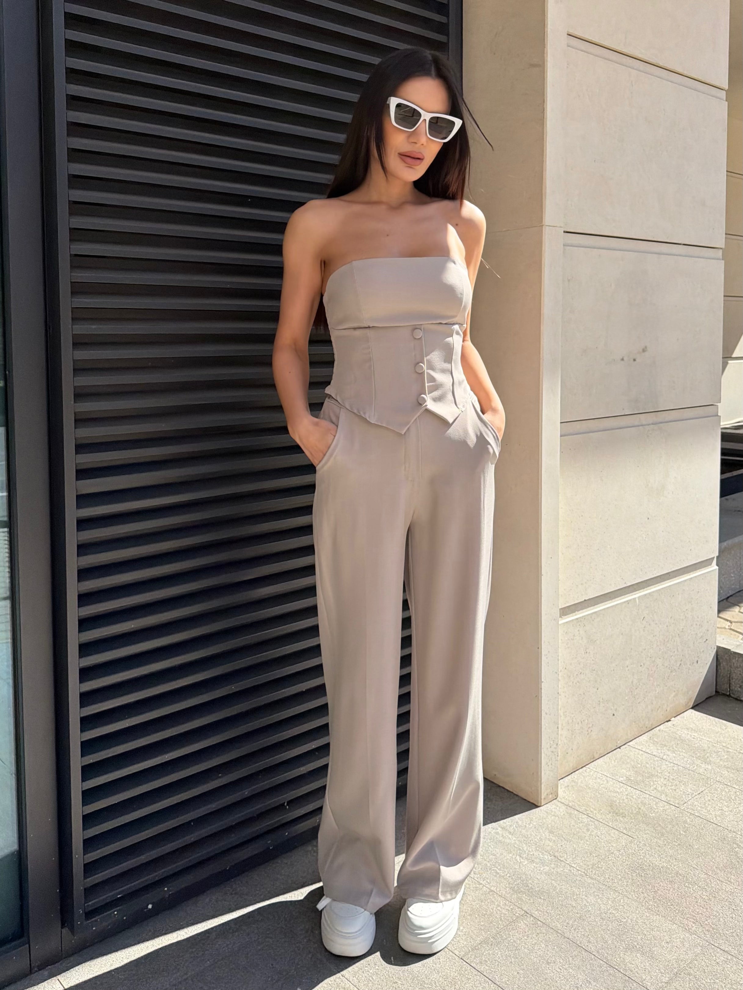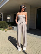 Elegant women's set featuring a corset-style bustier and high-waisted trousers, designed to enhance the silhouette and create a refined feminine look.