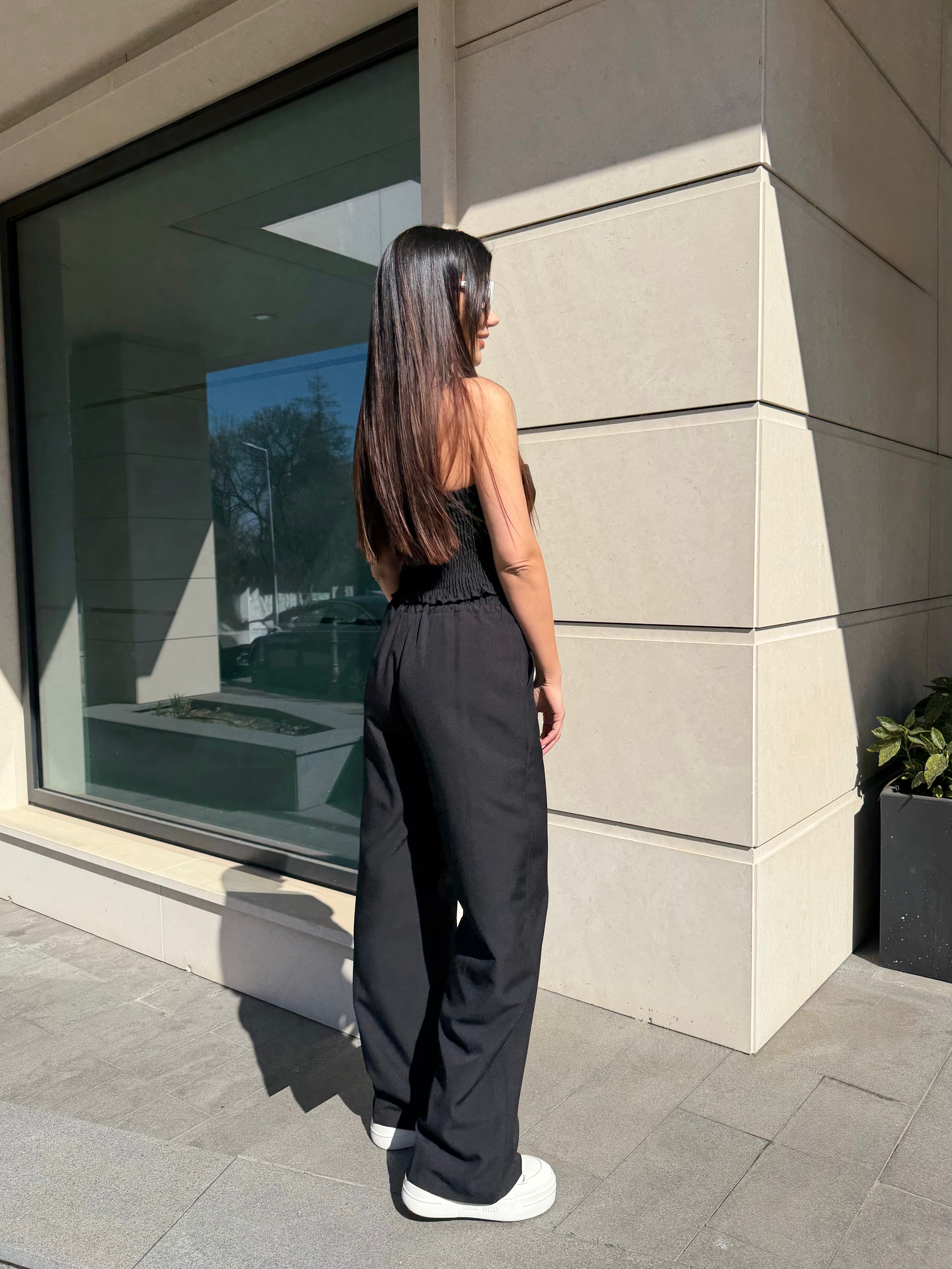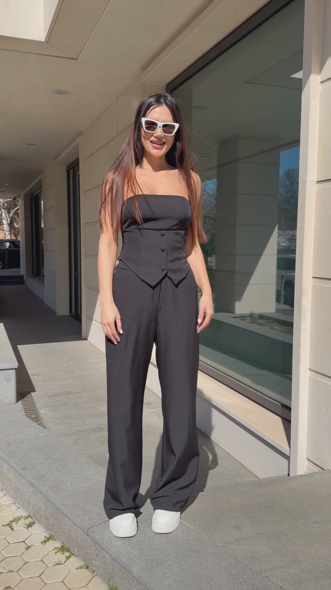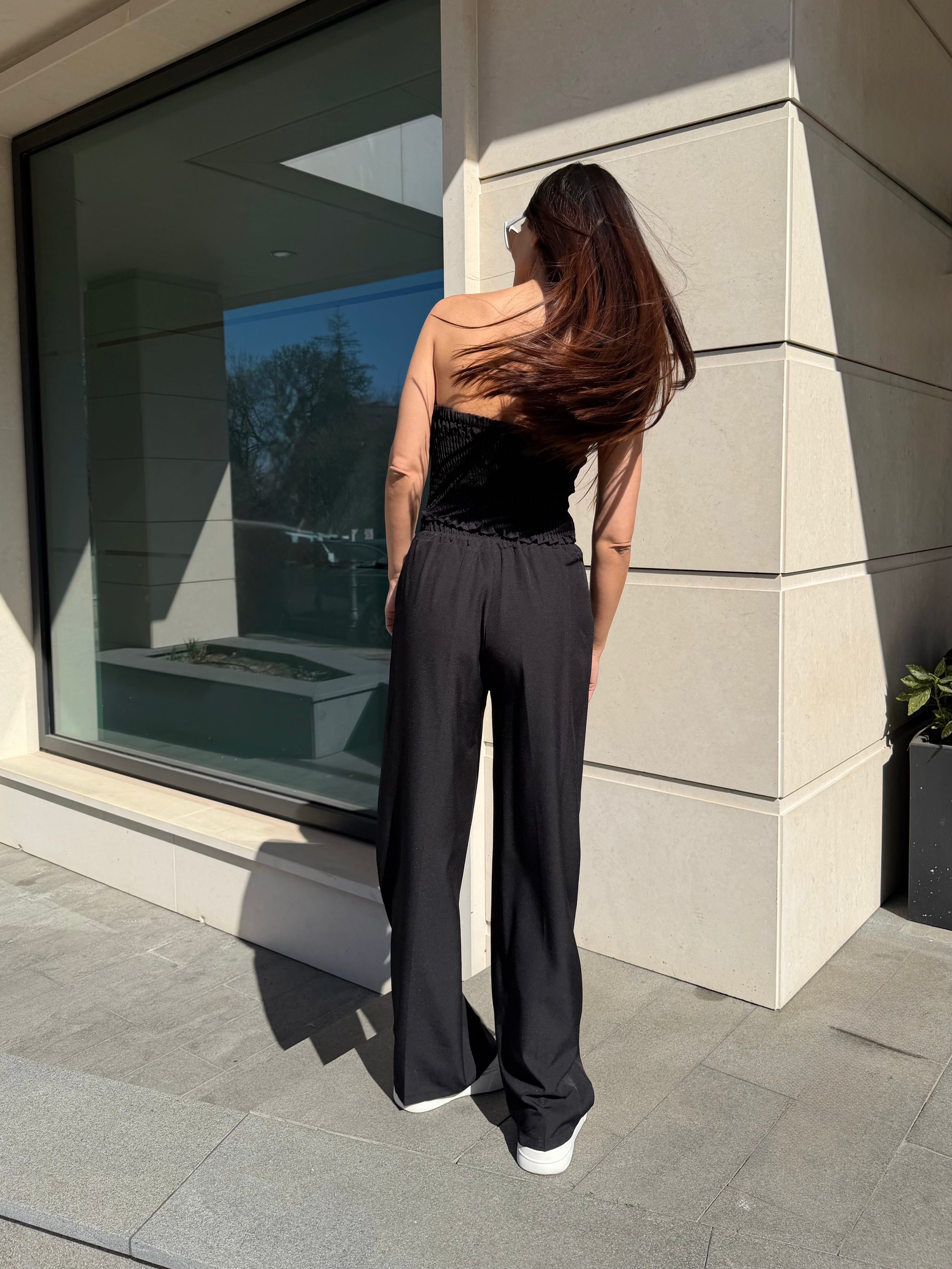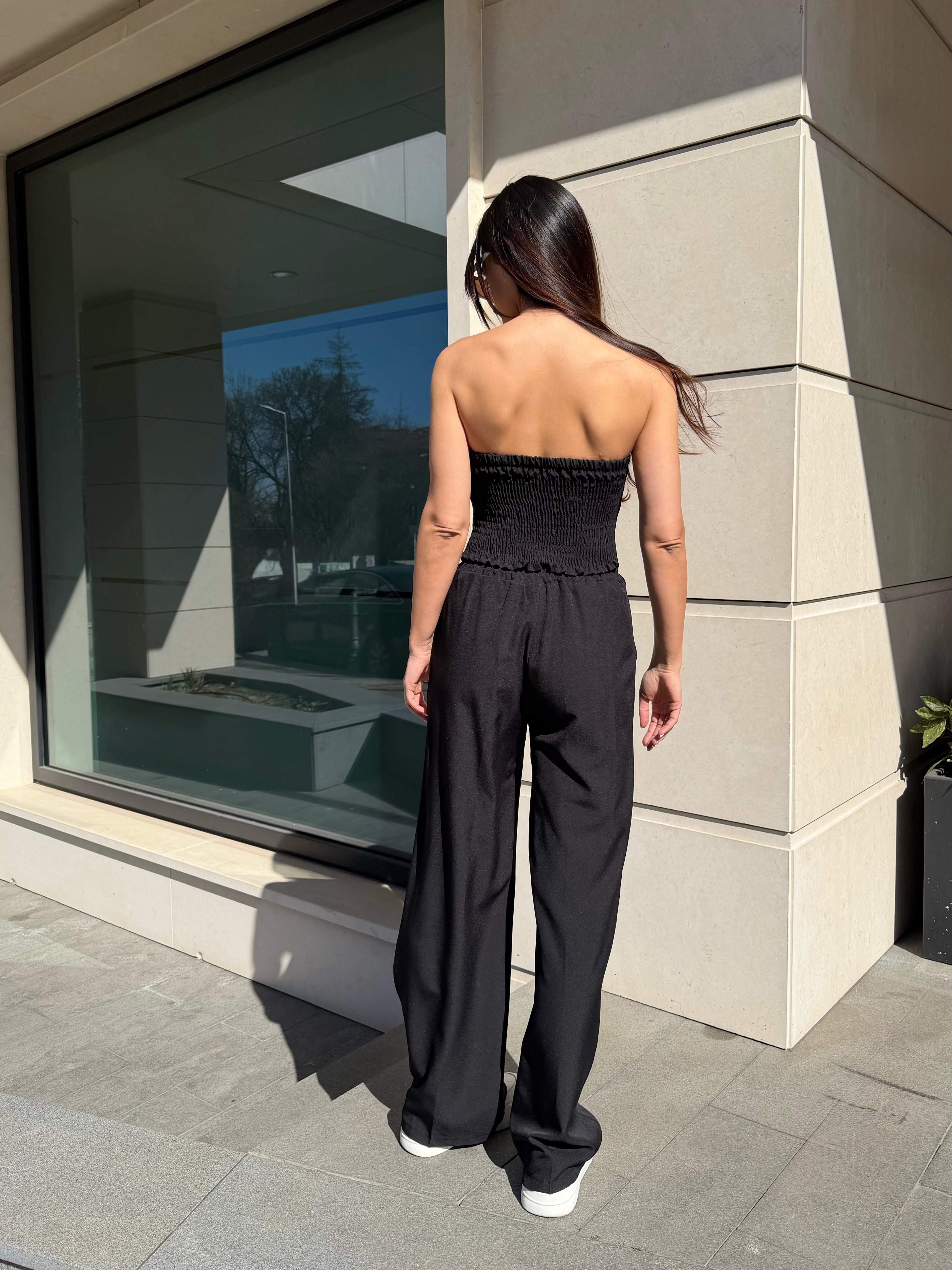 The bustier shapes the body with its elastic back, while the relaxed-fit trousers balance the look with modern elegance.