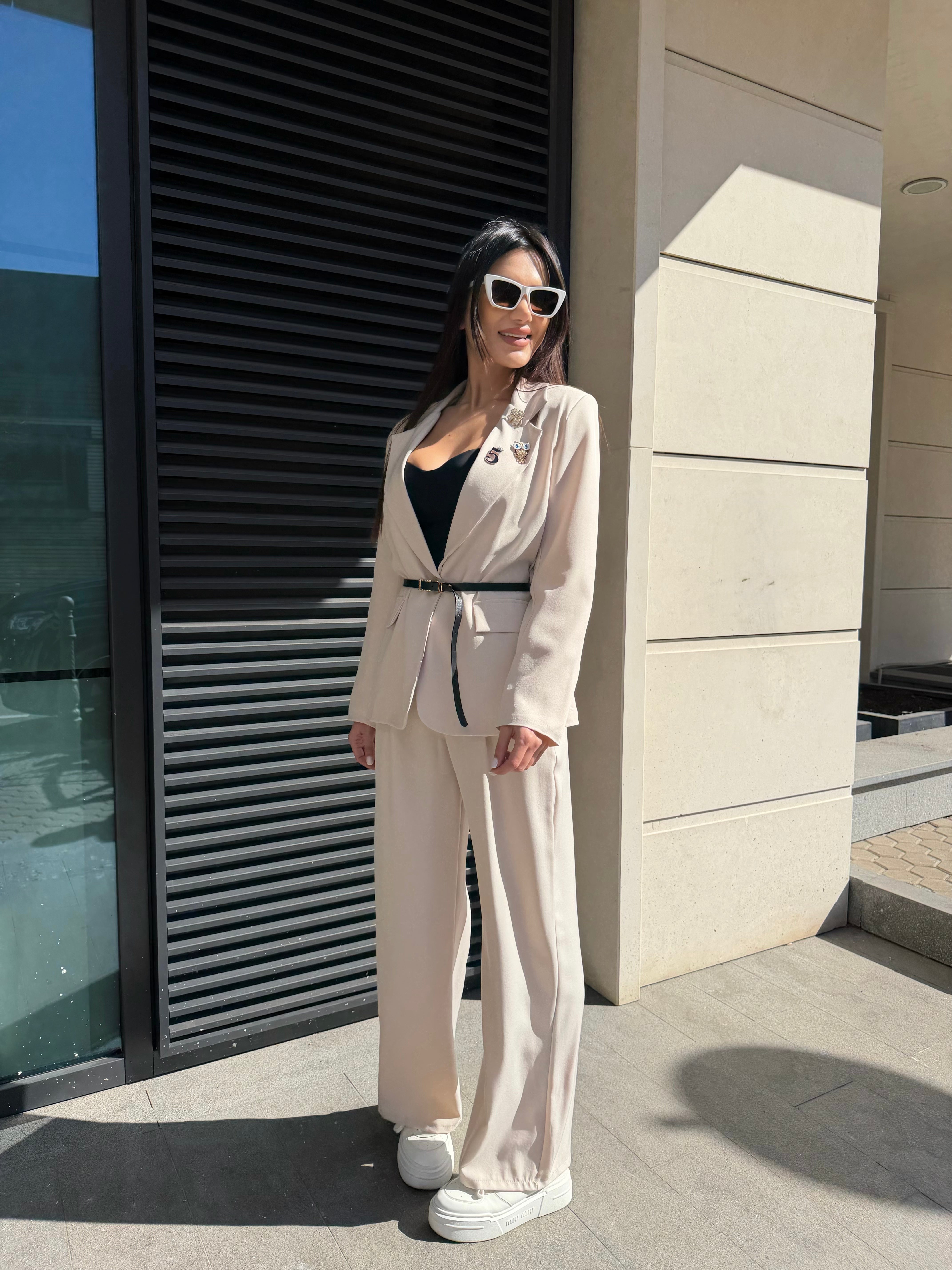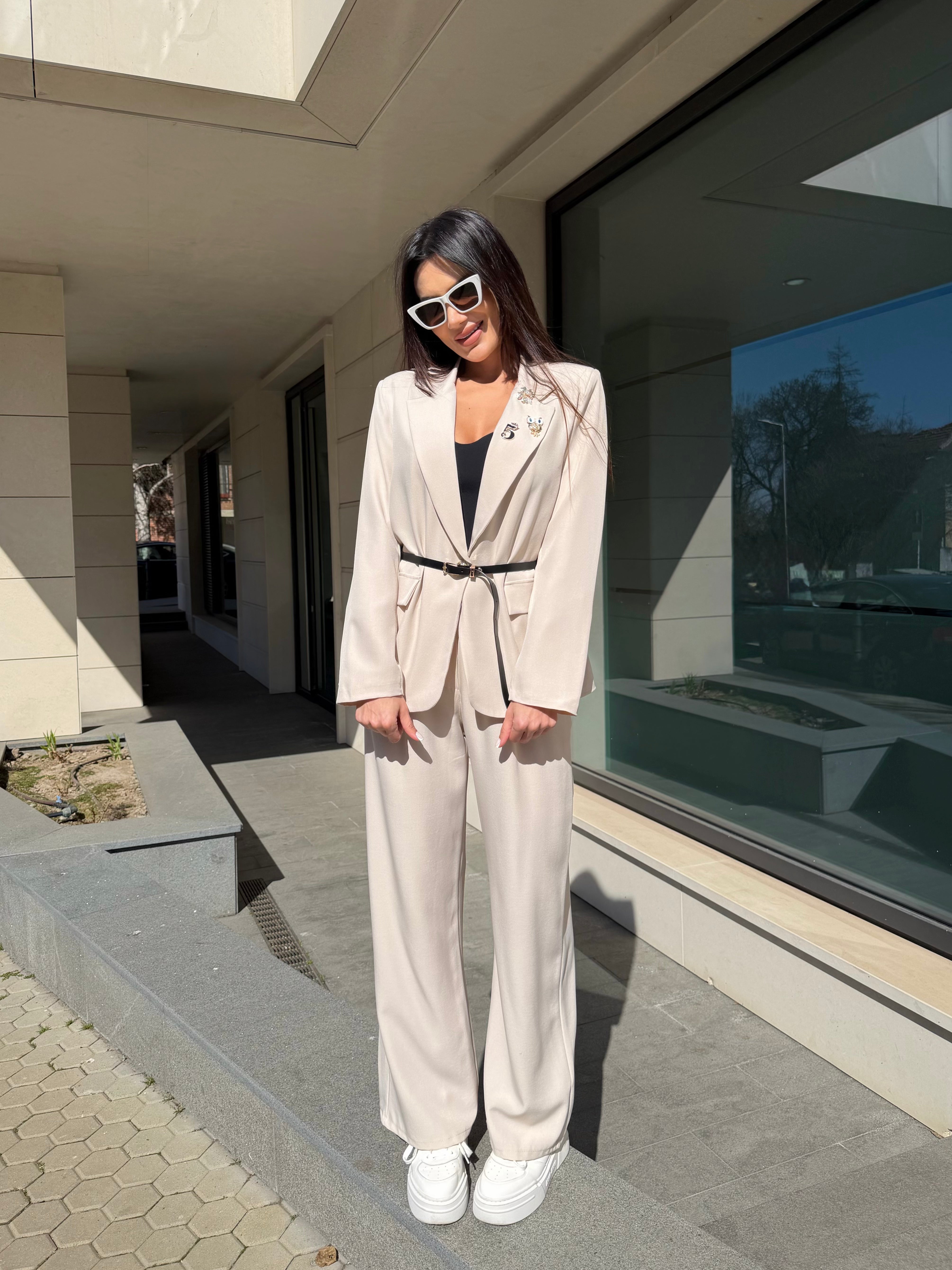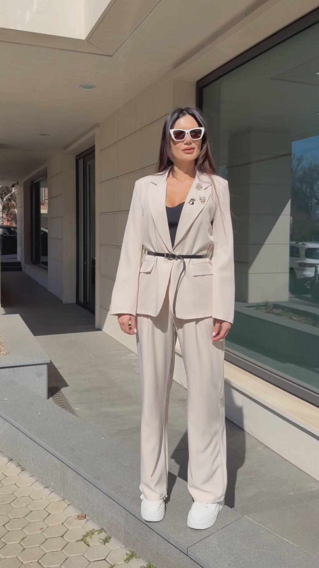 The model features a straight fit design complemented by a leather waist belt that enhances the silhouette and adds a feminine touch. Decorative brooches give the suit a stylish and refined finish.