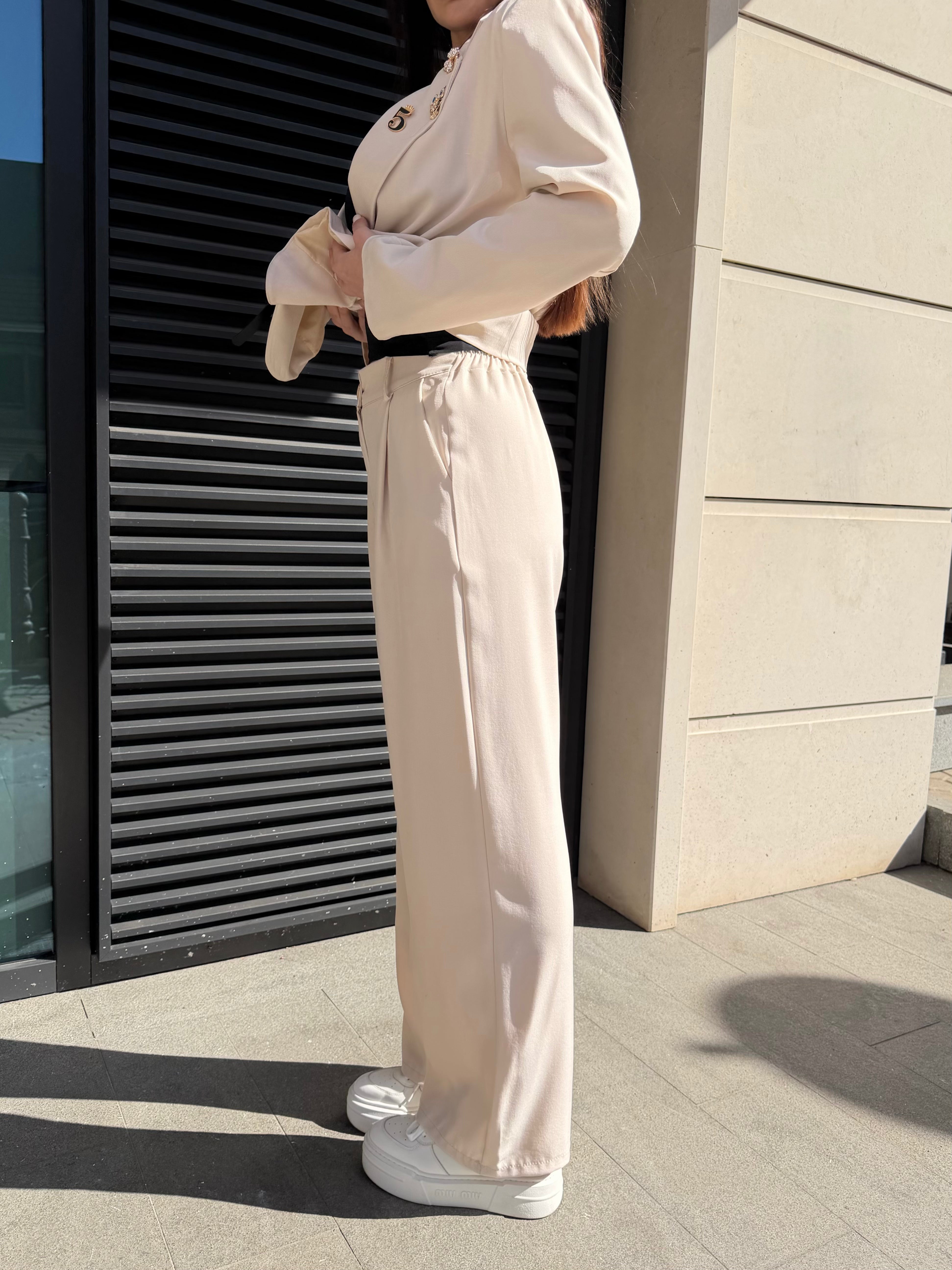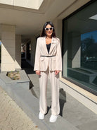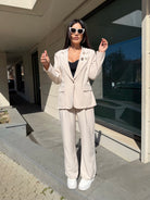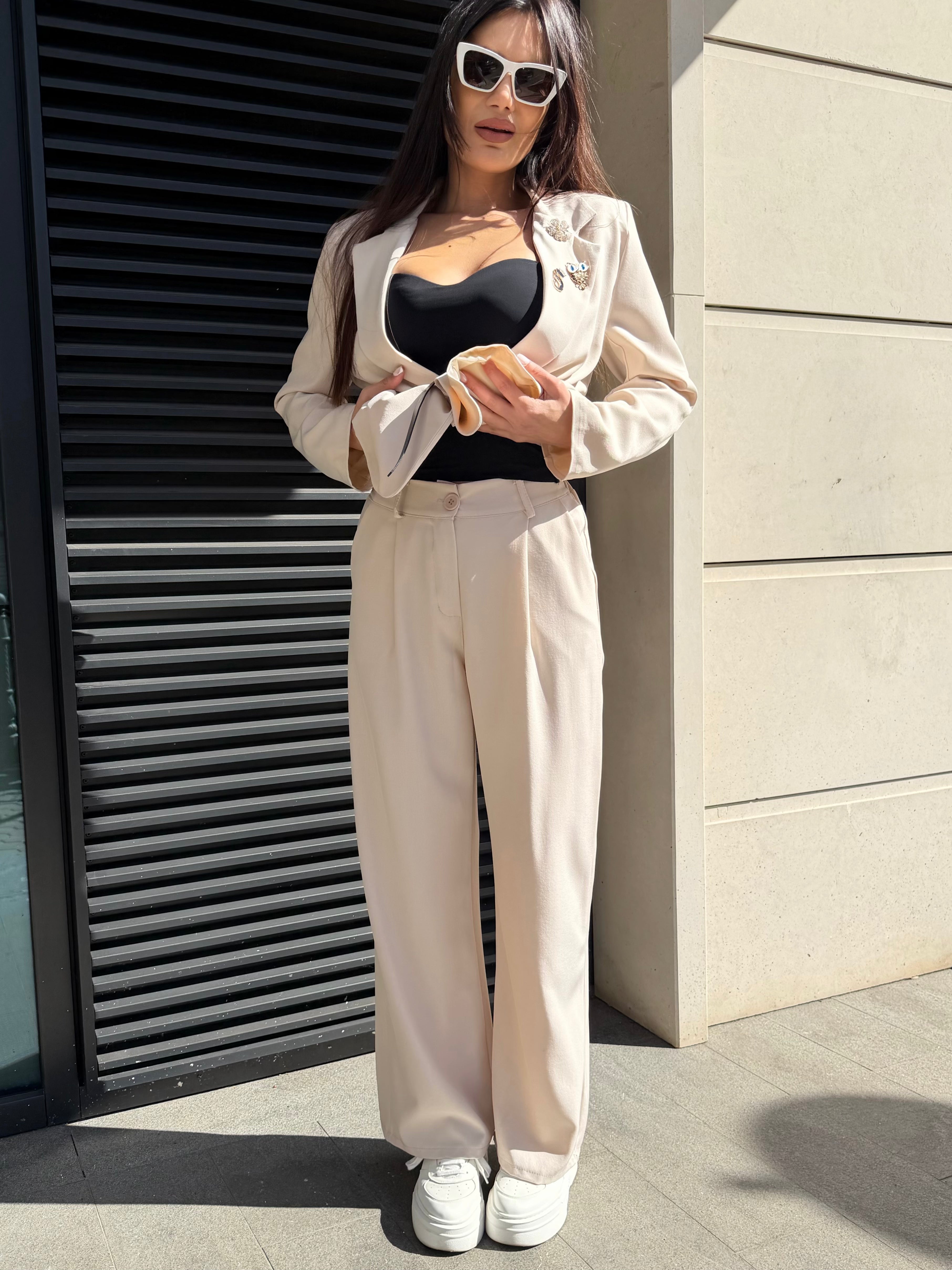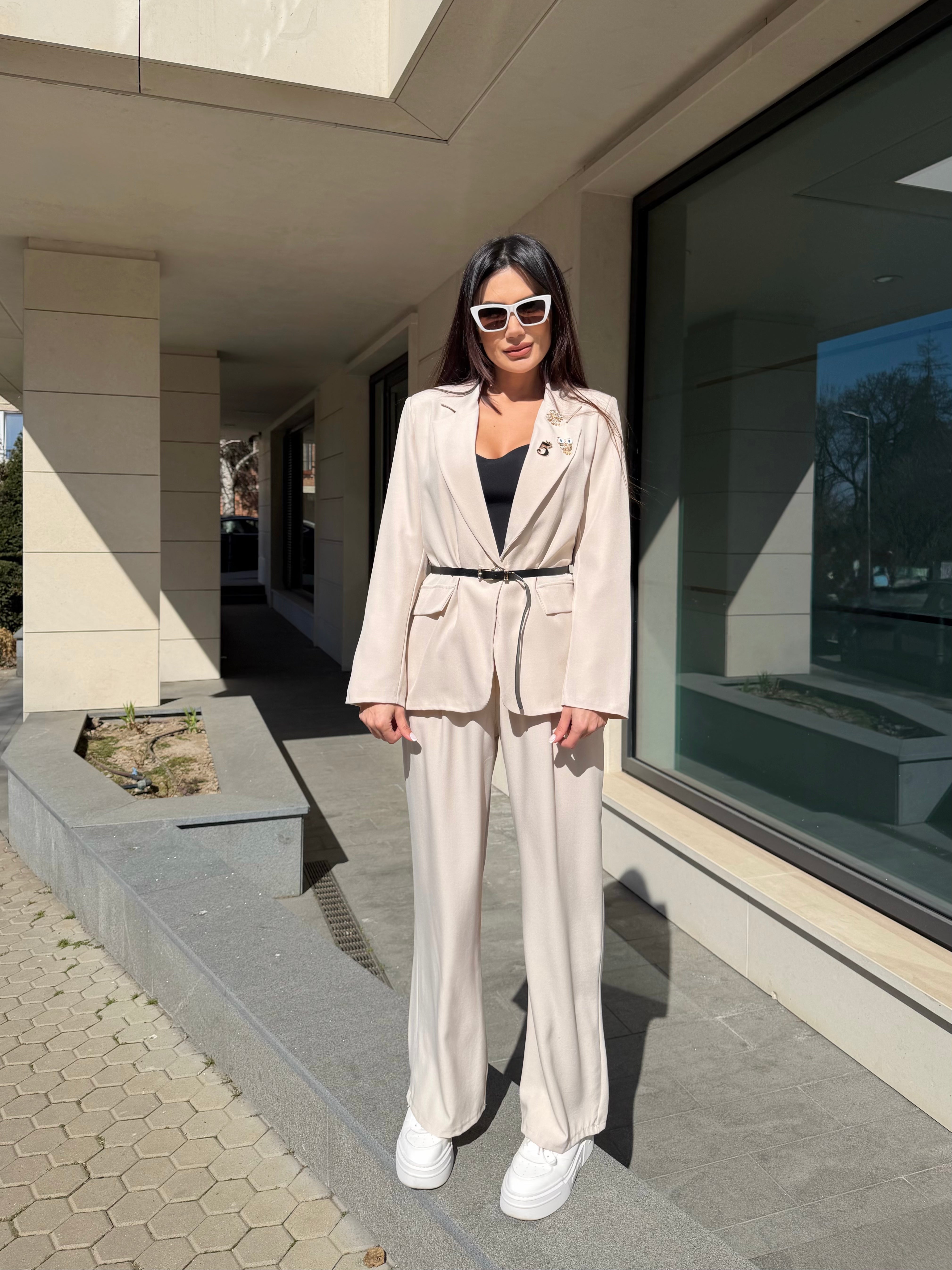 Elegant women's suit with a clean, modern silhouette. The blazer highlights the waist while the trousers create a long and sophisticated line.
