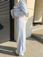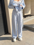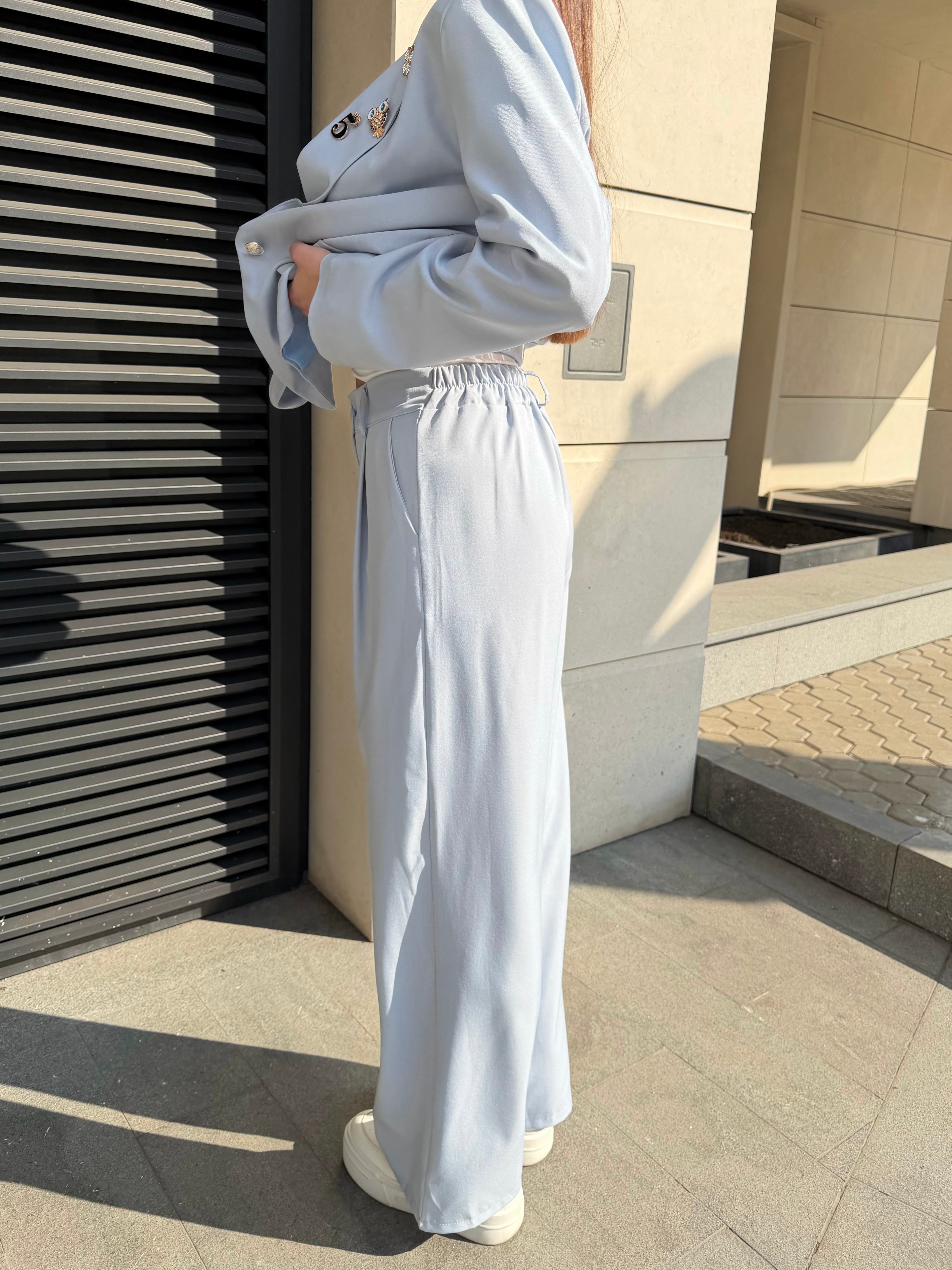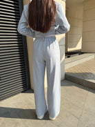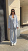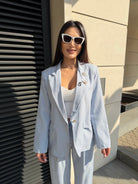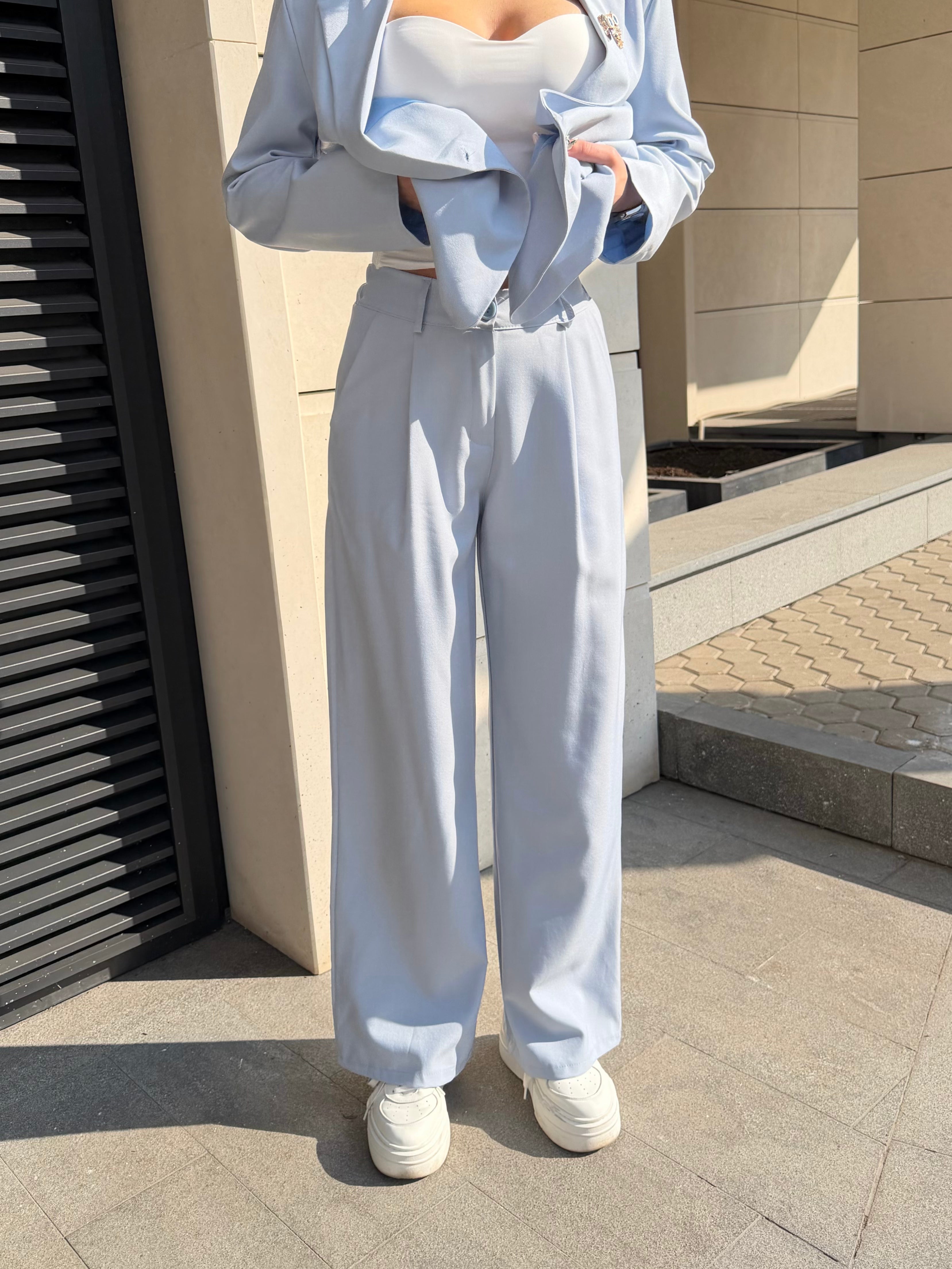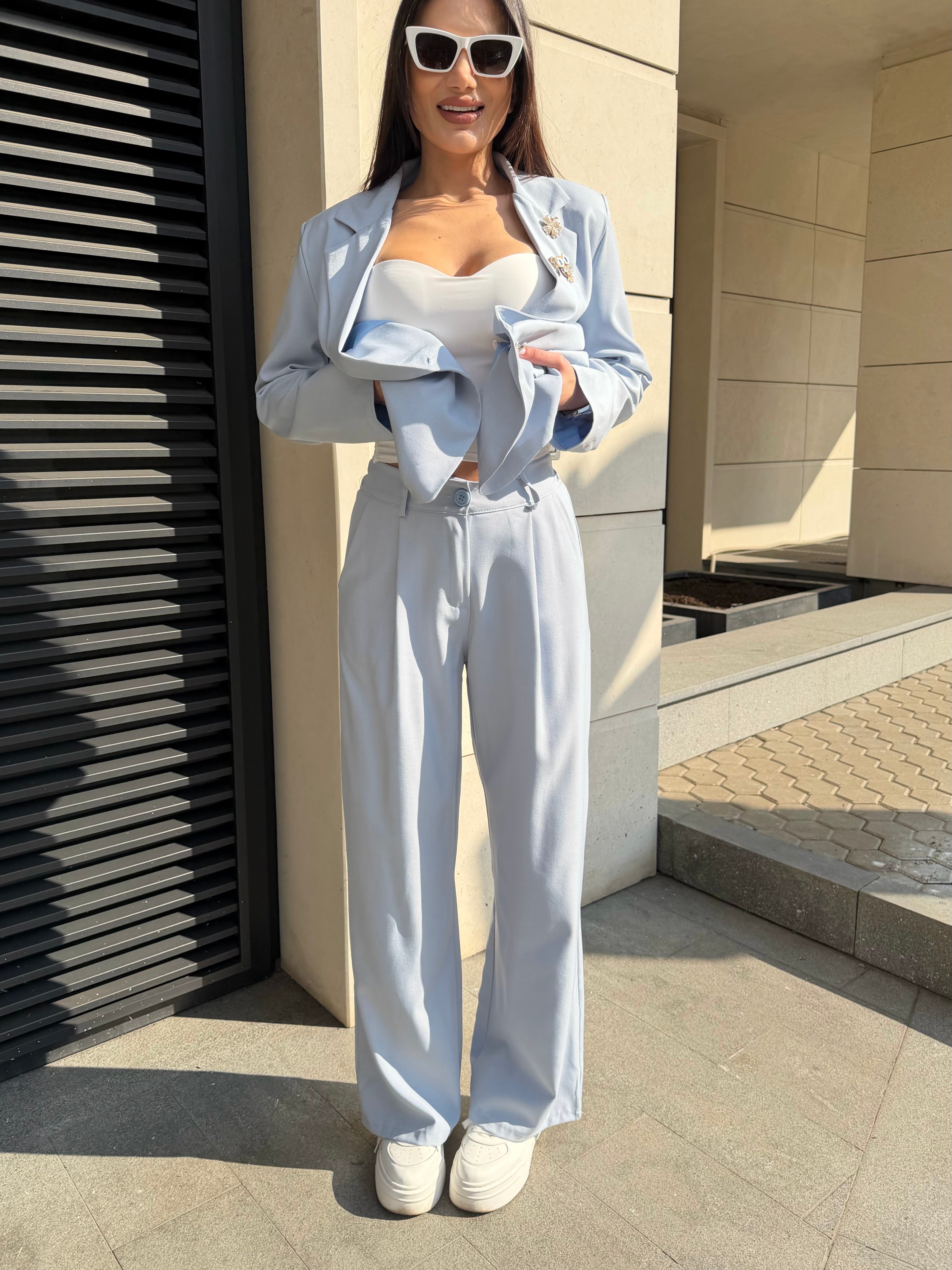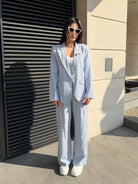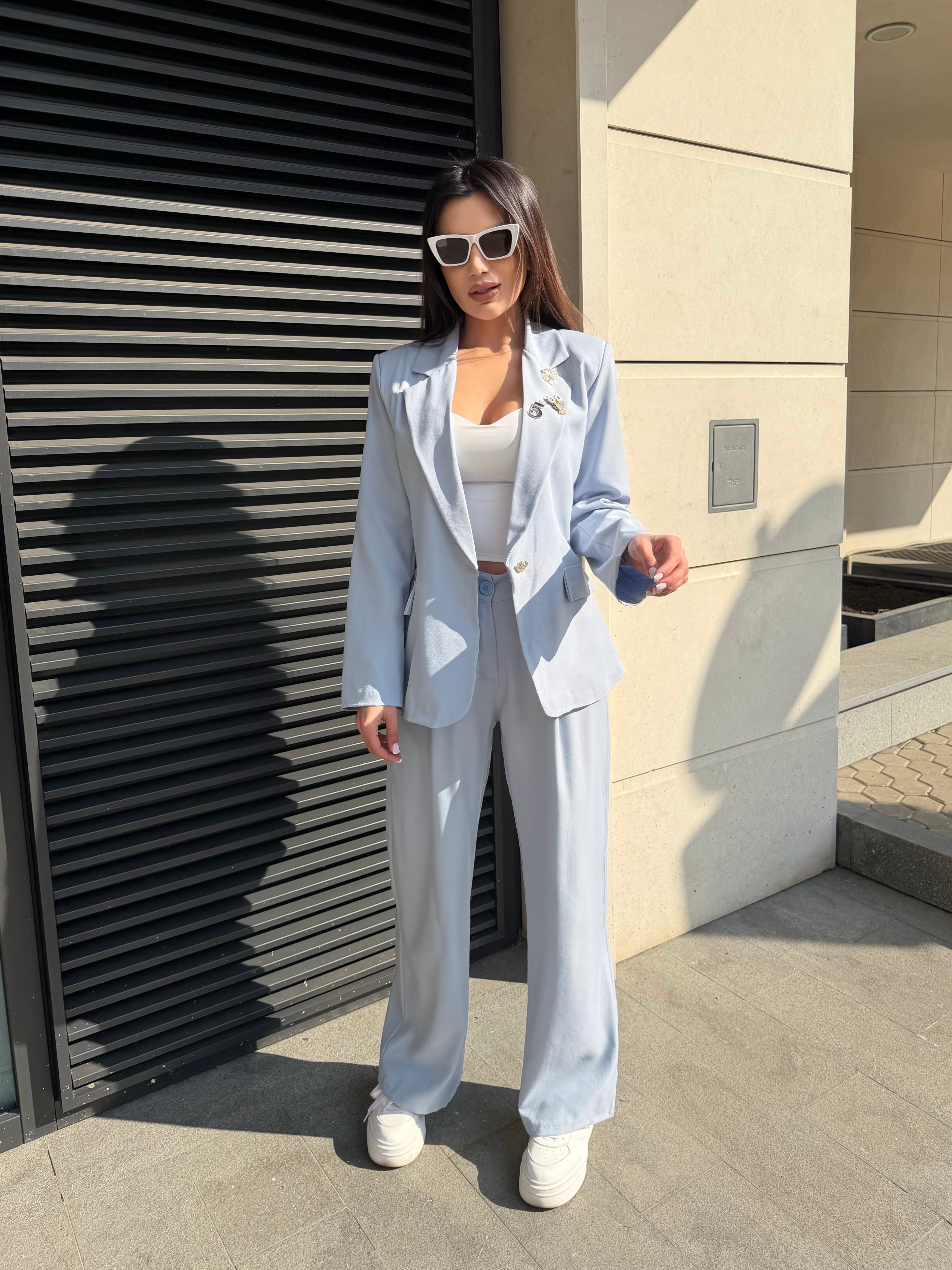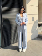 Elegant women's suit with a clean, modern silhouette. The blazer highlights the waist while the trousers create a long and sophisticated line.