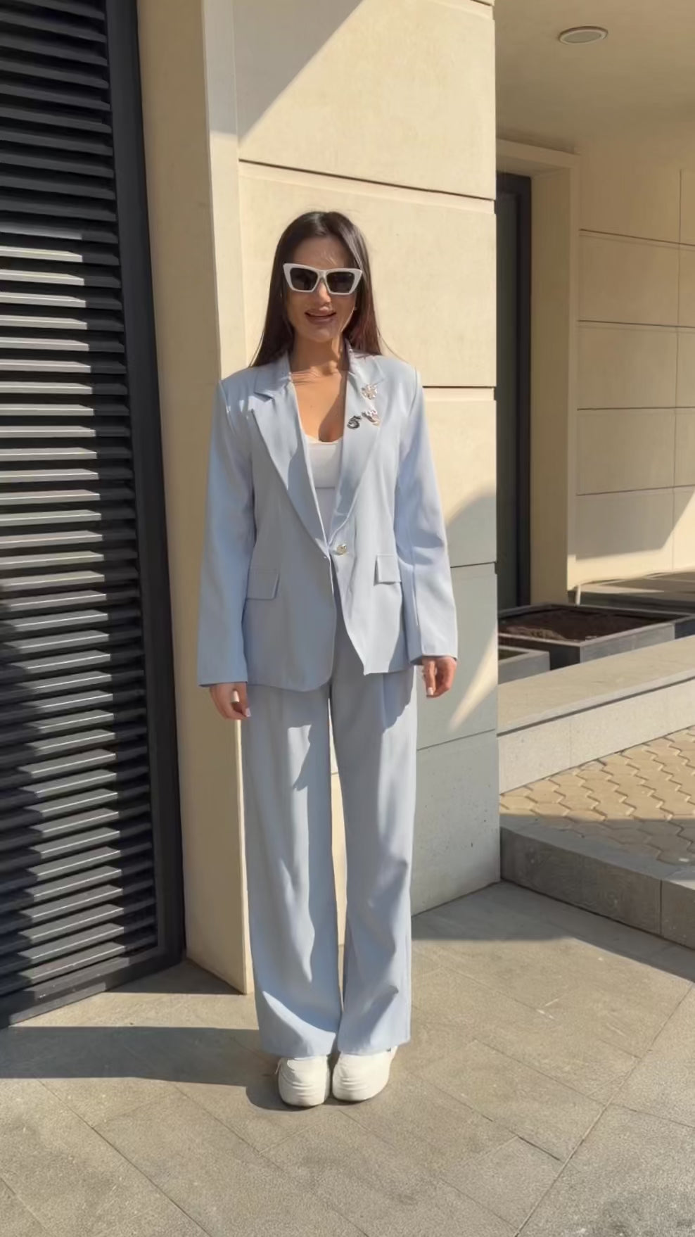 The model features a straight fit design complemented by a leather waist belt that enhances the silhouette and adds a feminine touch. Decorative brooches give the suit a stylish and refined finish.