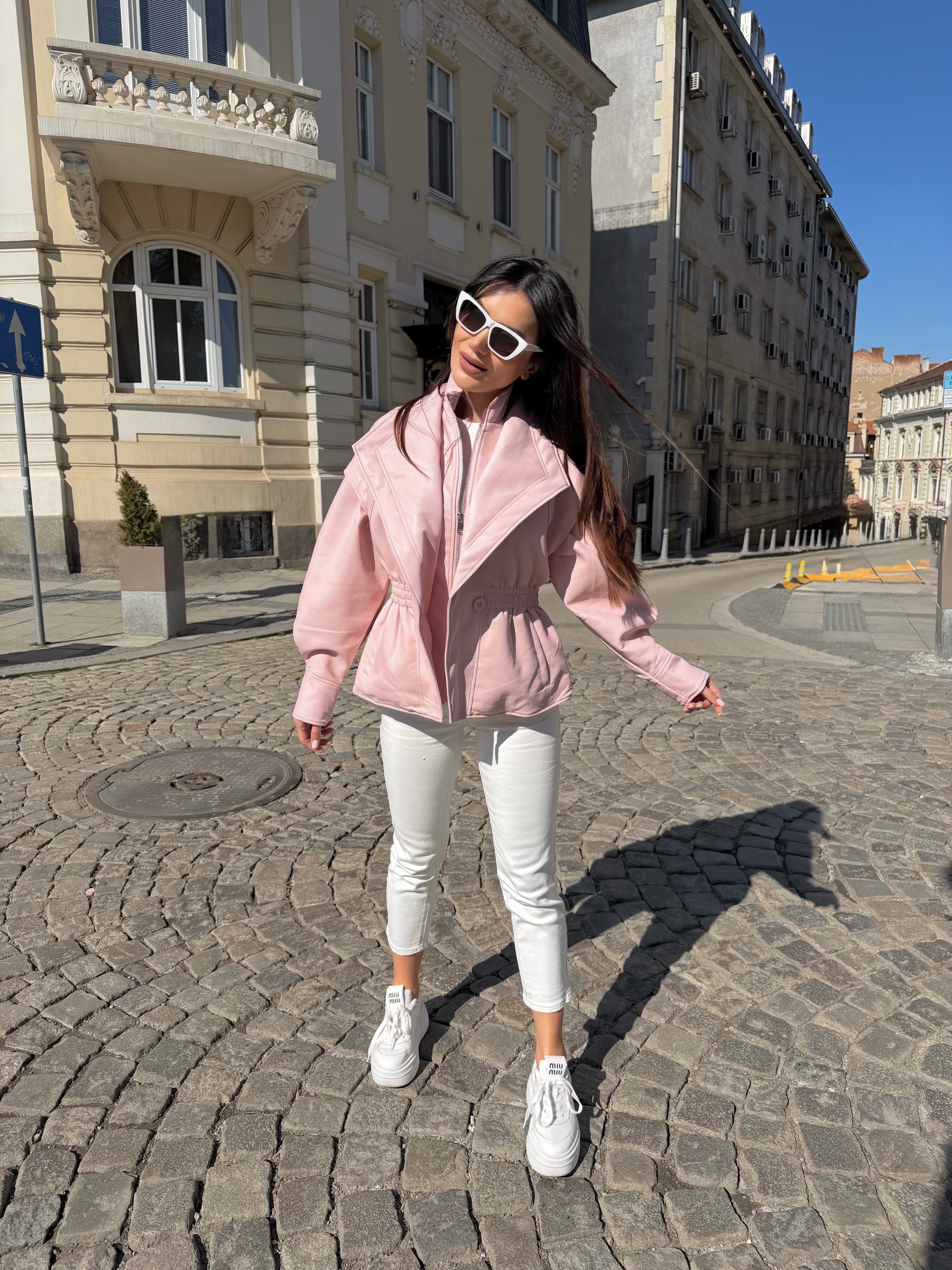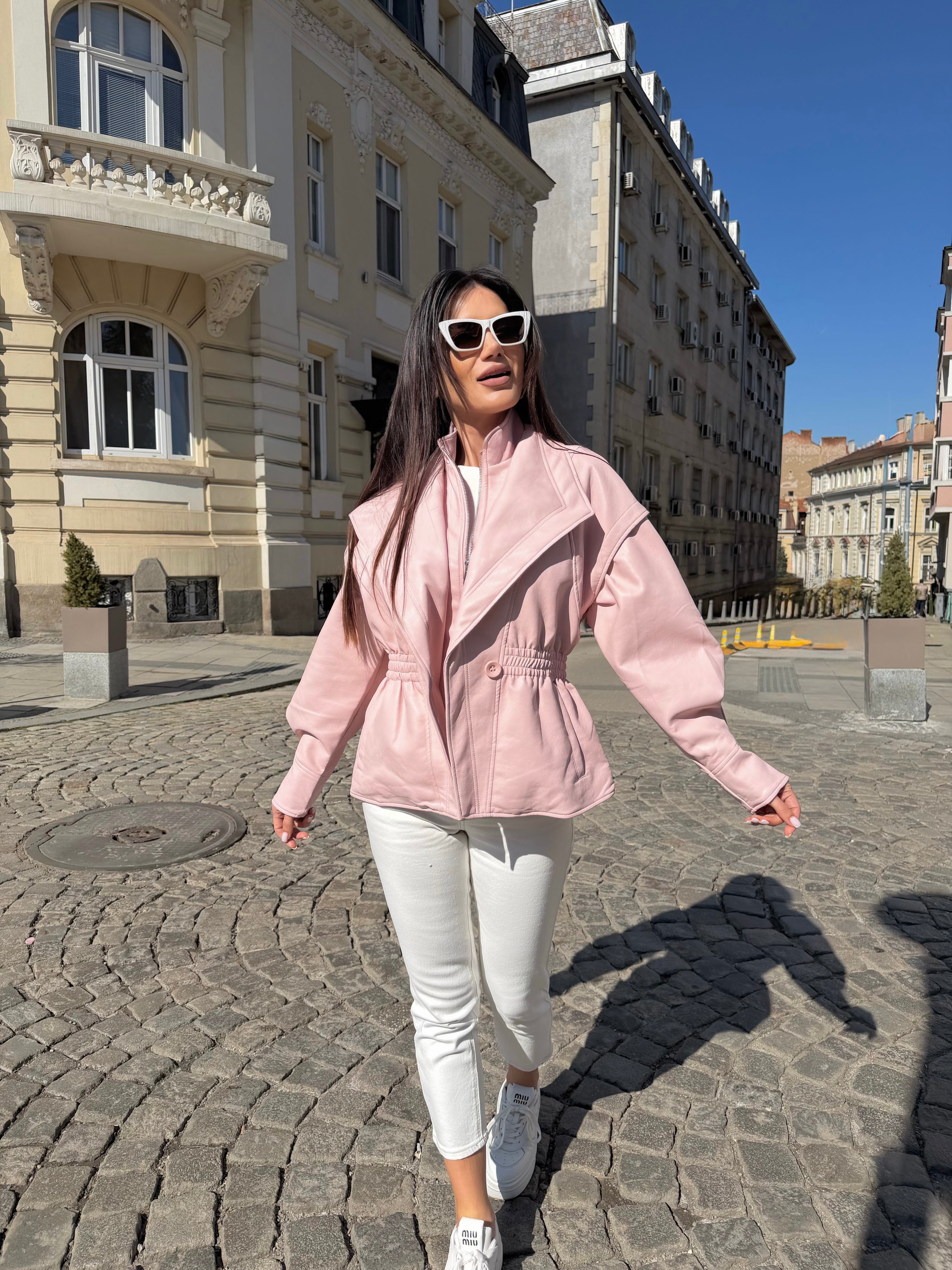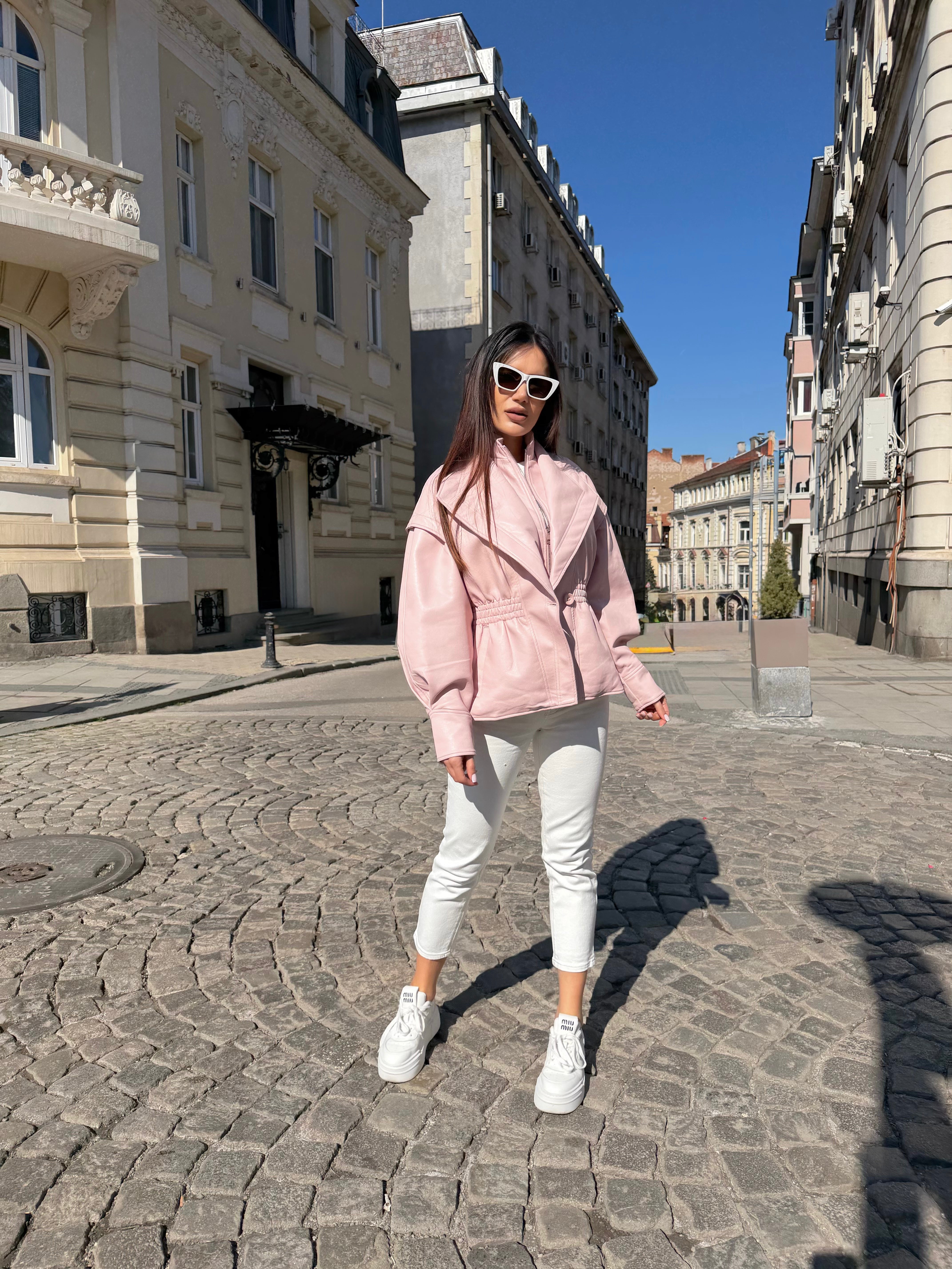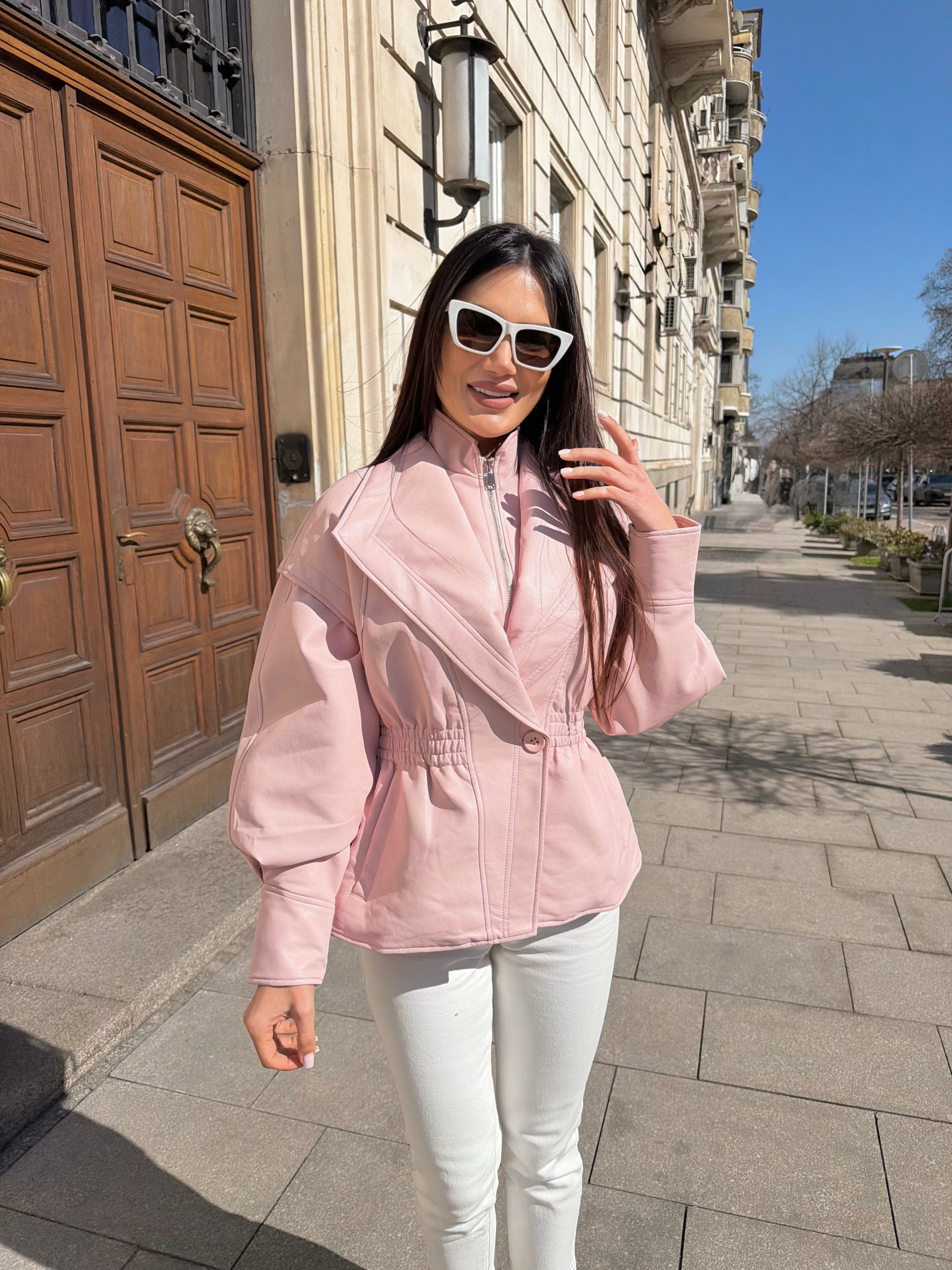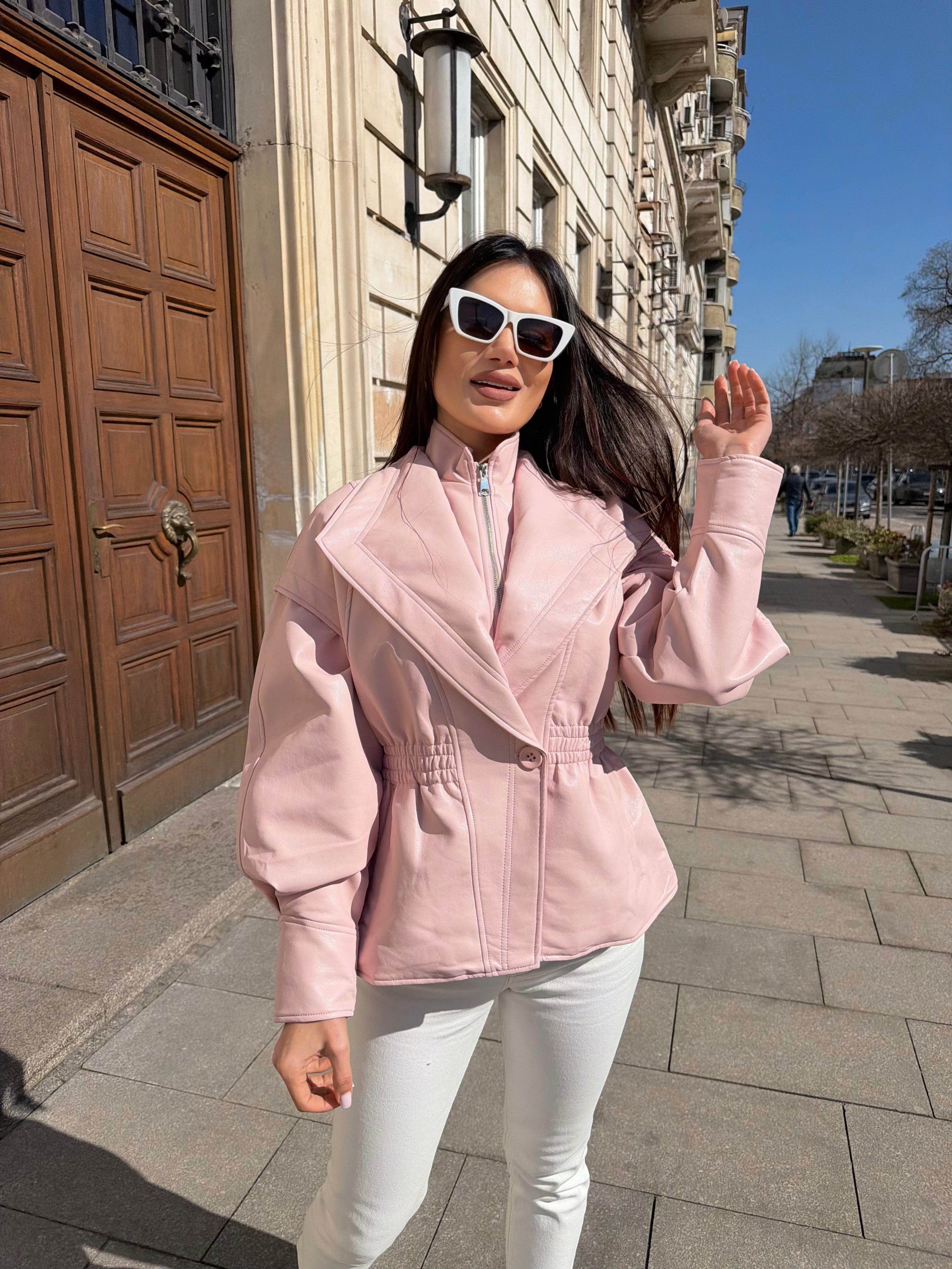 A modern silhouette with a dramatic edge. This eco-leather jacket features voluminous sleeves and a waist-defining fit that enhances the figure. Its refined construction and elegant line make it a must-have piece for the season.