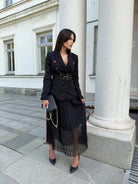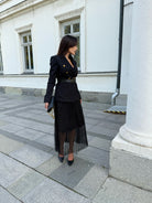 Black satin SKIRT with below-the-knee length and elastic waist.