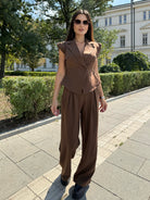TROUSERS: waist circumference - 66 cm (there is elastic in the back and stretches to 82 cm); hips - 108 cm; length - 107 cm.