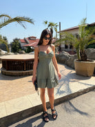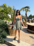 With the Sara dress in olive green you will feel like a summer dream. The fresh blue shade brings a feeling of lightness and sea breeze, and the gentle silhouette with gathered bust and ties on the shoulders gives a romantic look. Ideal for any occasion during the warm season.