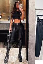 High-waisted leather leggings made of elastic and extremely comfortable material. The inside is lined with thin wadding.