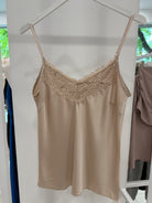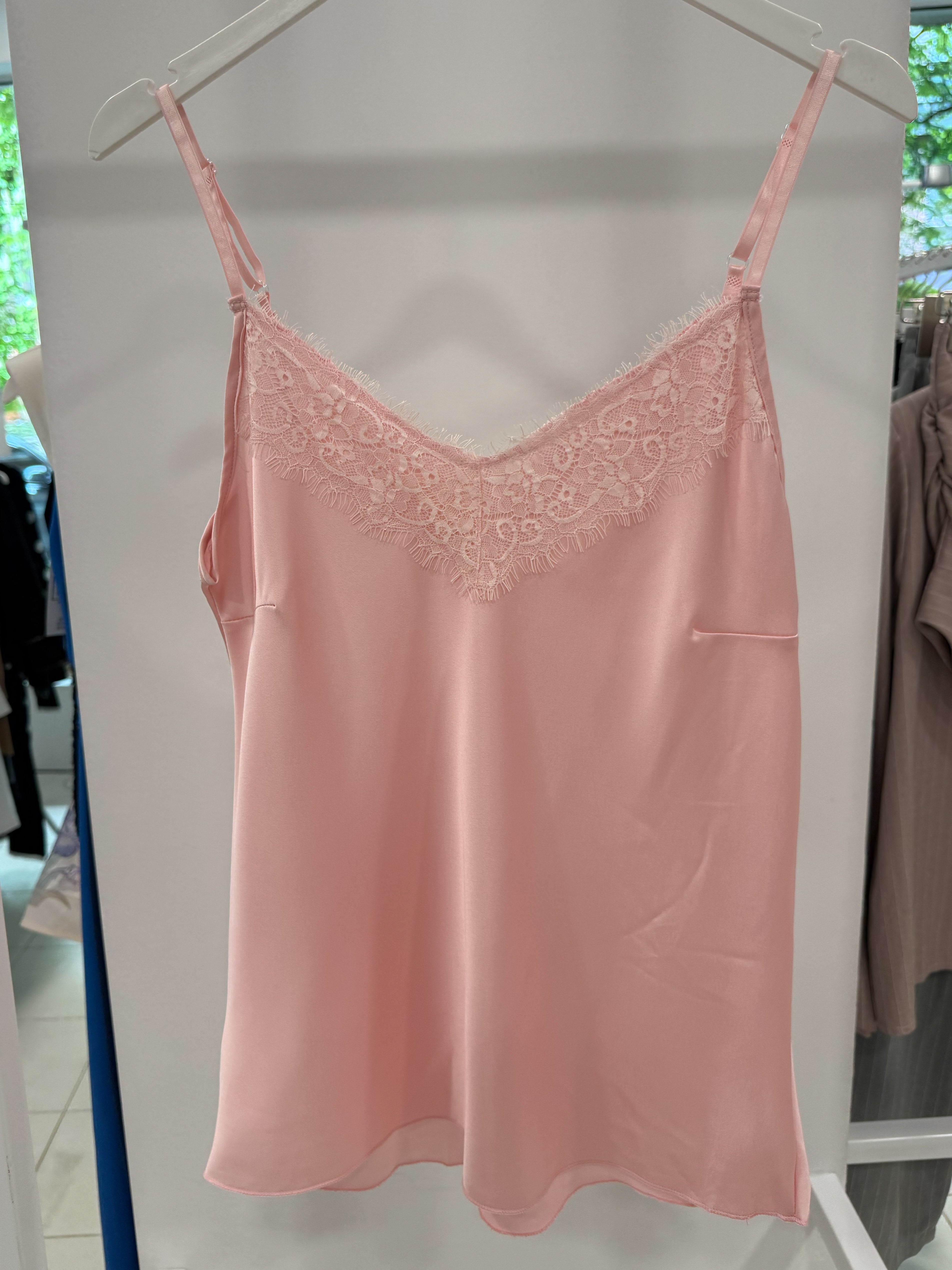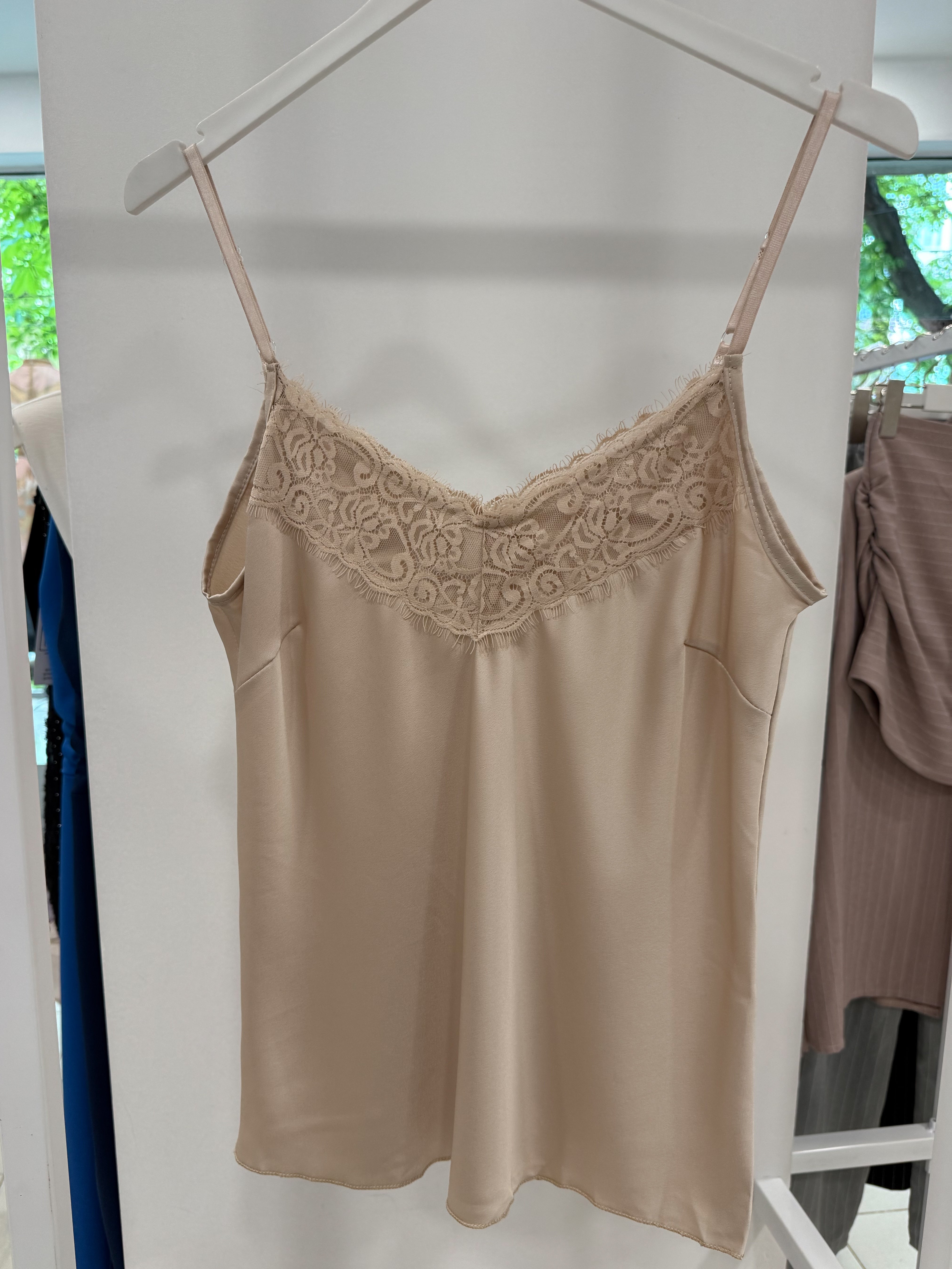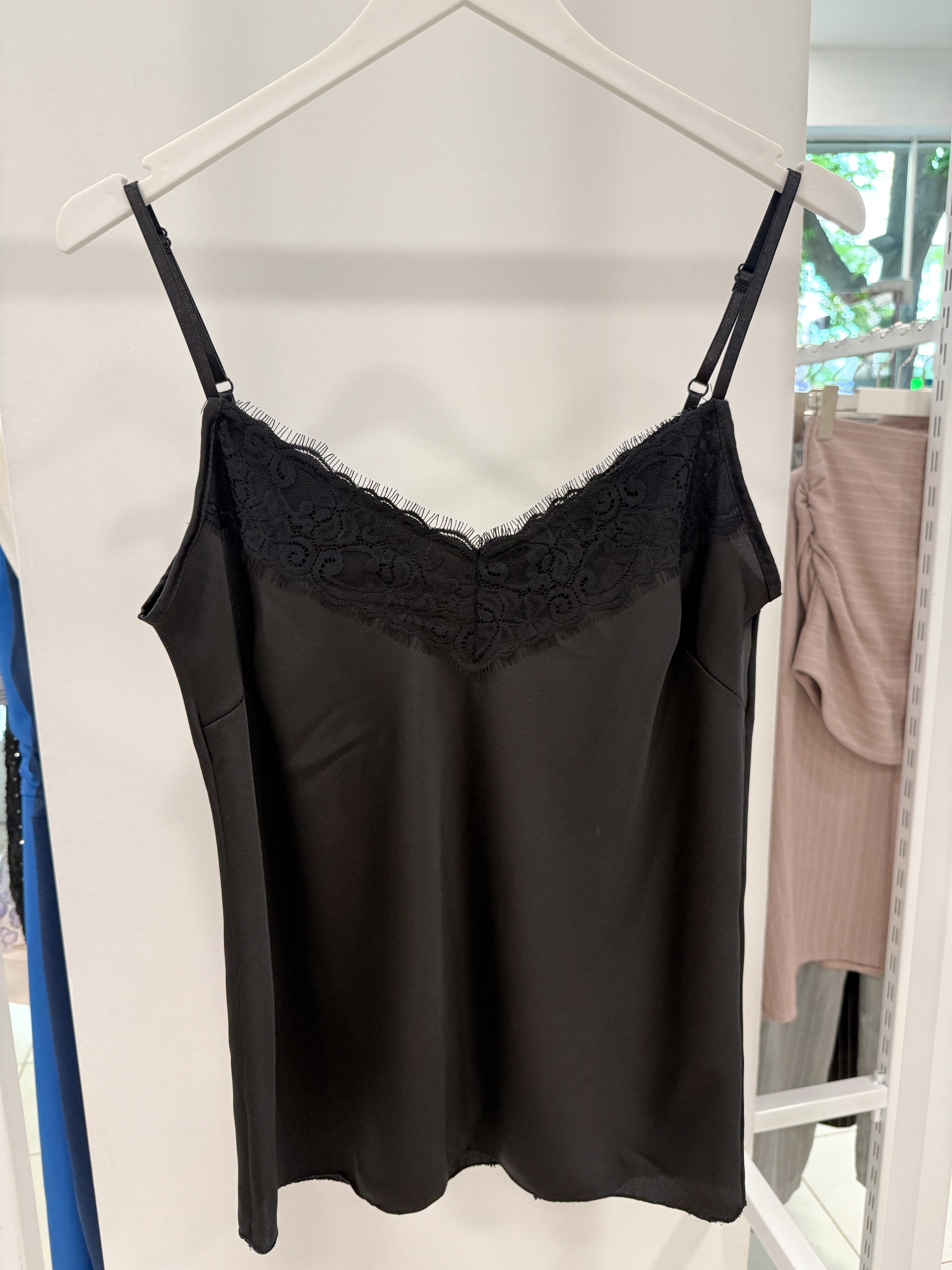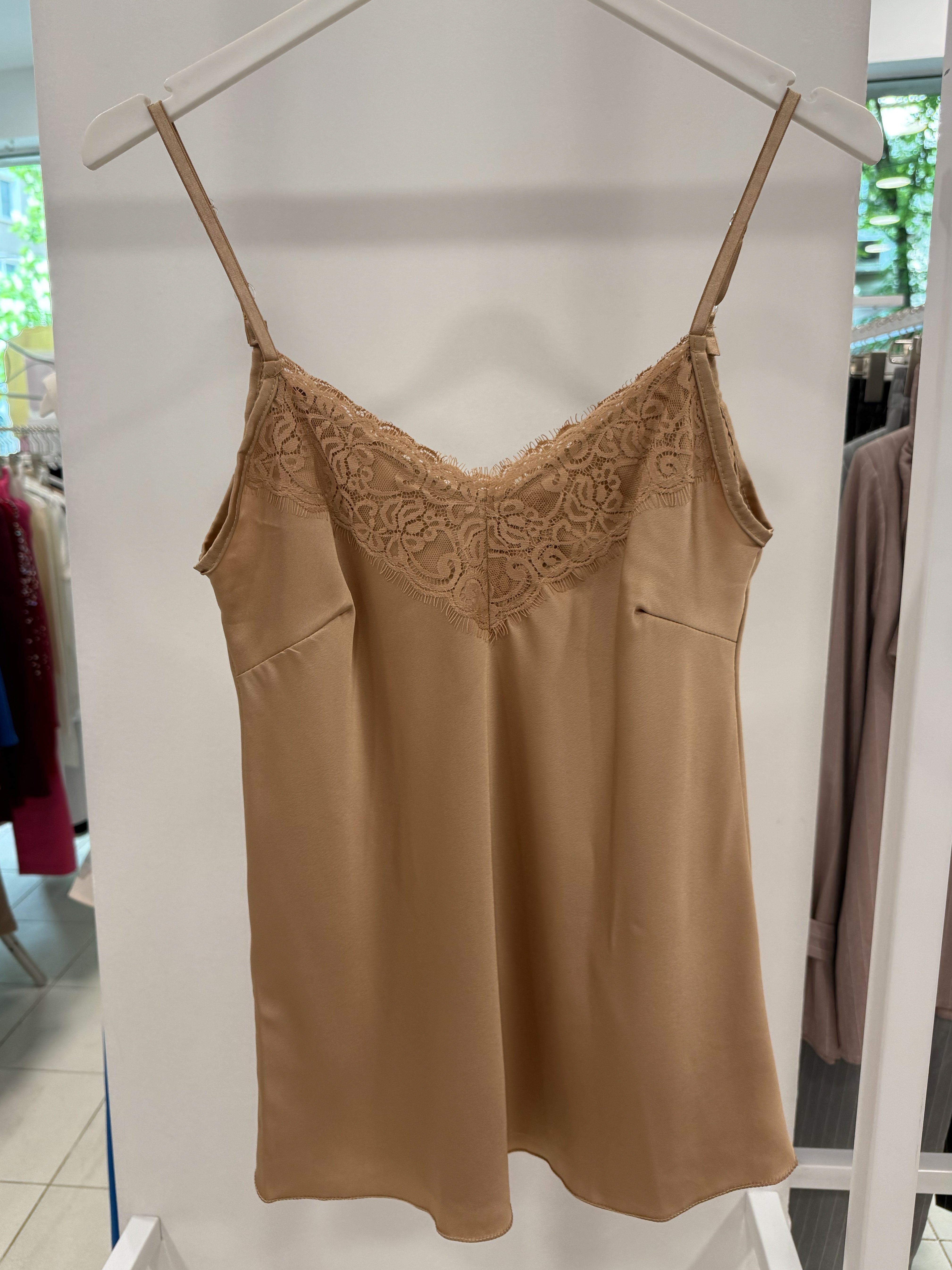 SATIN SWEATER WITH LACE on the neckline in the front and back.